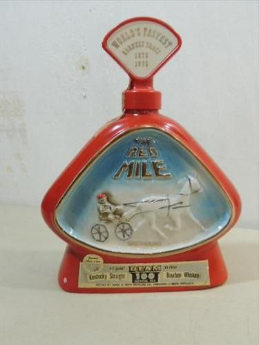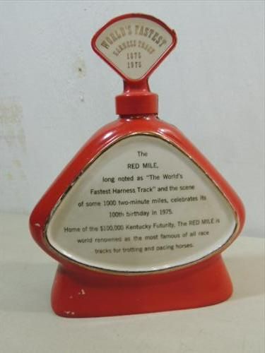 1975 VINTAGE JIM BEAM WHISKEY CERAMIC DECANTER: 100TH ANNIVERSARY THE RED MILE GREYHOUND. AS SHOWN. VIEW PICTURE FOR DETAIL.