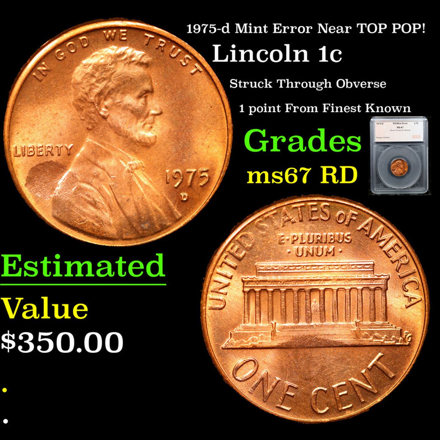 1975-d Mint Error Near TOP POP! Lincoln Cent 1c Graded ms67 RD By SEGS.