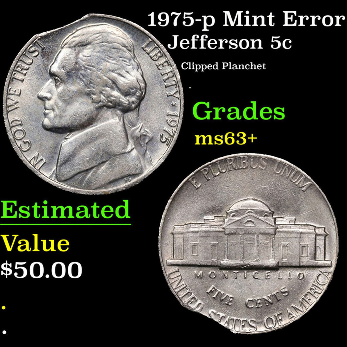 1975-p Mint Error Jefferson Nickel 5c Grades Select+ Unc.