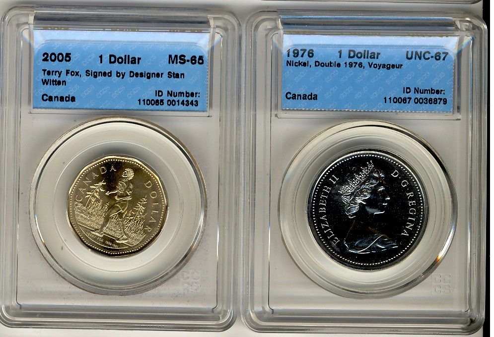 1976 1 Dollar Nickel, UNC67, 2005 1 Dollar, T. Fox MS65, ; Two CCCS coins.