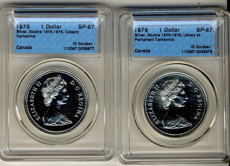 1976 1 Dollar Parliament, 1975 Calgary CCCS SP67; Both Silver issues.