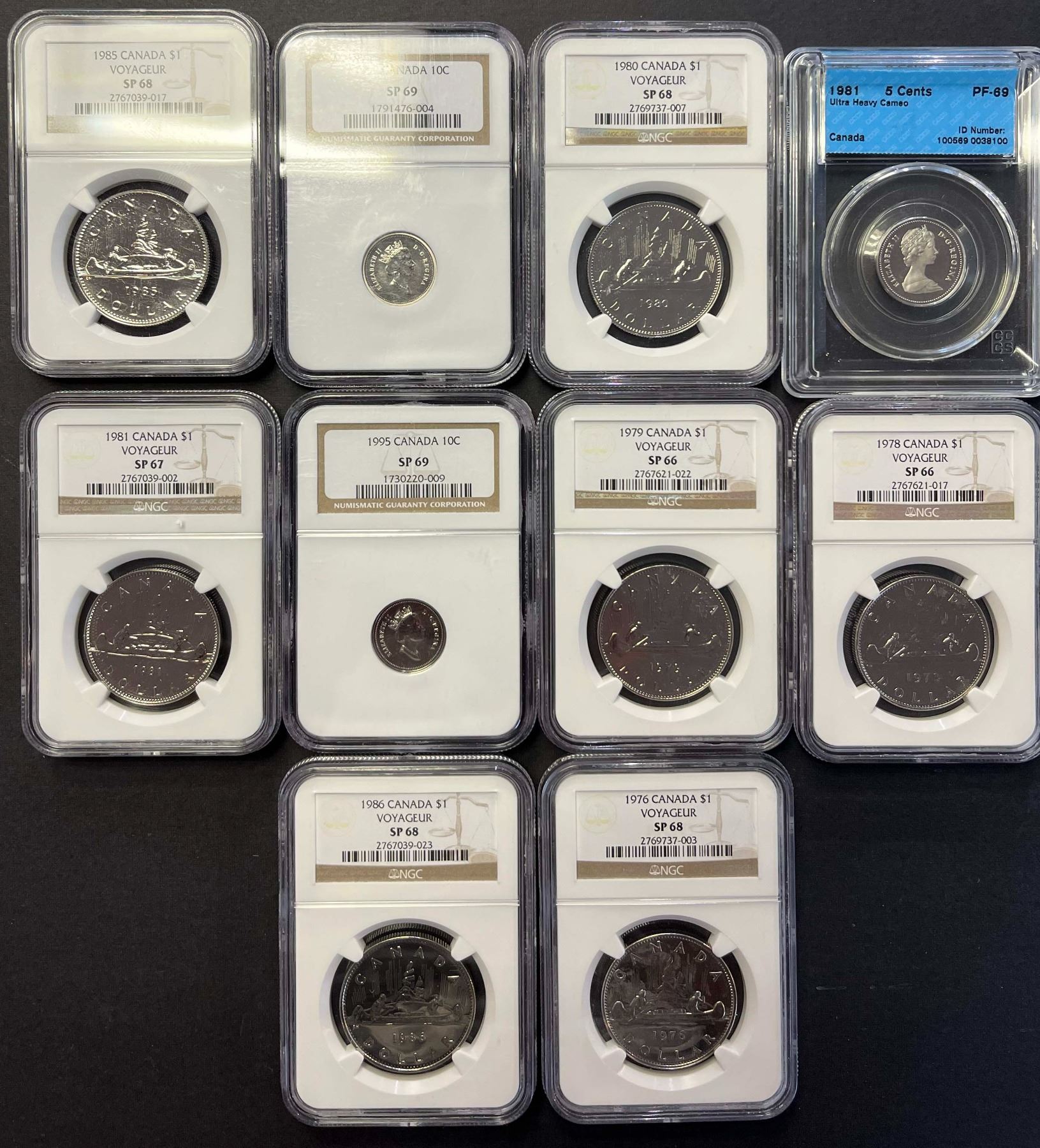1976 $1 Nickel, to 1986 all NGC graded Superb Gem SPECIMEN-66 to Splendid SPECIMEN-68, 1995 10¢, 1999 10¢ both NGC Splendid SPECIMEN-69 & 1981 5¢ CCCS PF69 Ultra Hvy Cameo. Lot of 10 coins.