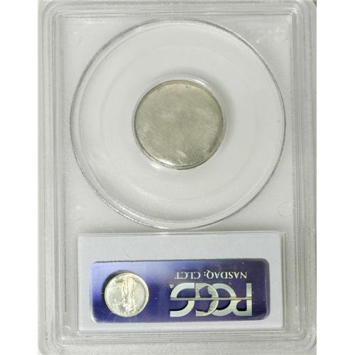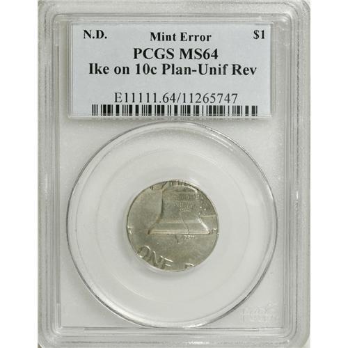 <B>1976-? $1 Type Two Bicentennial Dollar--On a 10C Planchet, Uniface Reverse--MS64 PCGS.</B></I> A dime planchet and an Ike dollar planchet were fed between the dies at the same time. The dollar planchet (not included) blocked the obverse die. Although struck on a dime planchet, the piece has the approximate diameter of a nickel. The centering favors the Liberty Bell, which is complete except for its handle. It would be very difficult to find another uniface Bicentennial dollar struck on a dime planchet, so opportunity knocks for the wrong planchet error specialist.<BR><BR><b>Shipping:</b> Coins & Currency (<a target="_blank" href="http://www.heritageauctions.com/common/shipping.php">view shipping information</a>)