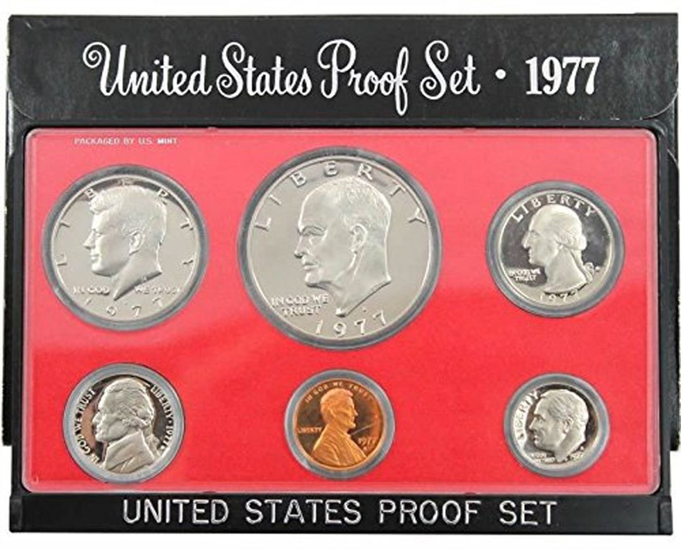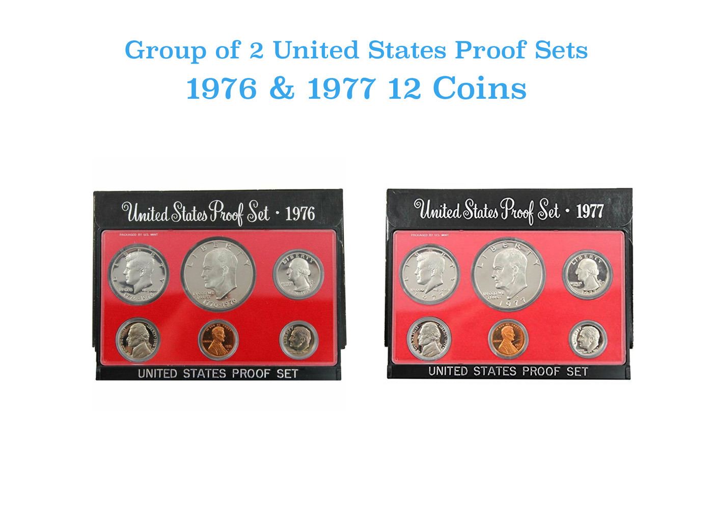1976 & 1977 United Stated Mint Proof Set. The 1976 set Includes 6 Cameo Proof Coins Including the Proof Bicentennial Washington Quarter, The Proof Bicentennial Kennedy Half Dollar and of course the Bicentennial Proof Eisenhower Dollar. The 1977 set ncludes 6 Deep Cameo Proof Coins Including the Eisenhower Proof Dollar