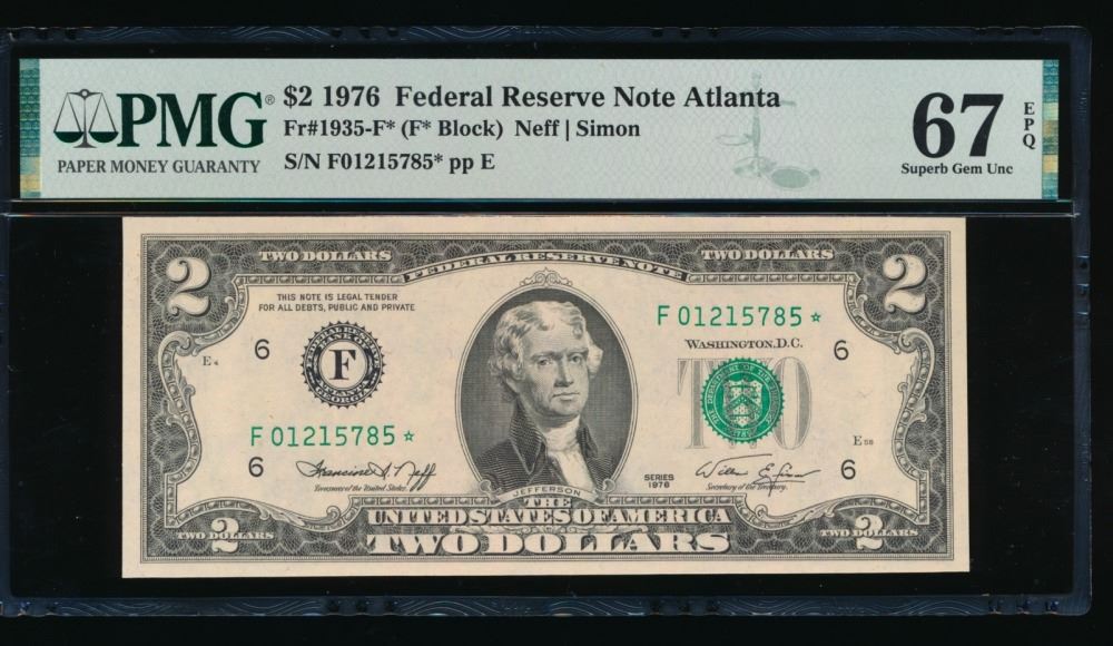 One 1976 $2 Atlanta Federal Reserve STAR Note PMG 67EPQ.