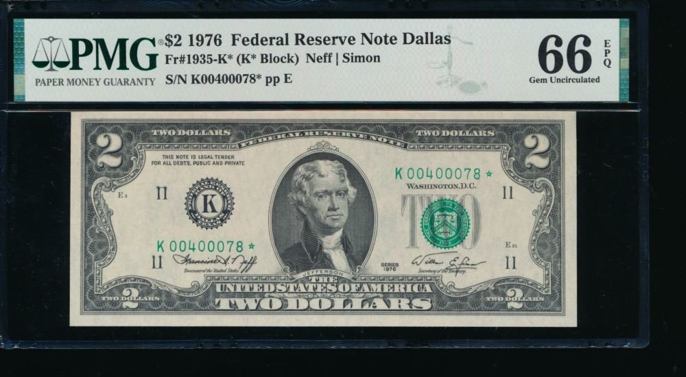 One 1976 $2 Dallas Federal Reserve STAR Note PMG 66EPQ.