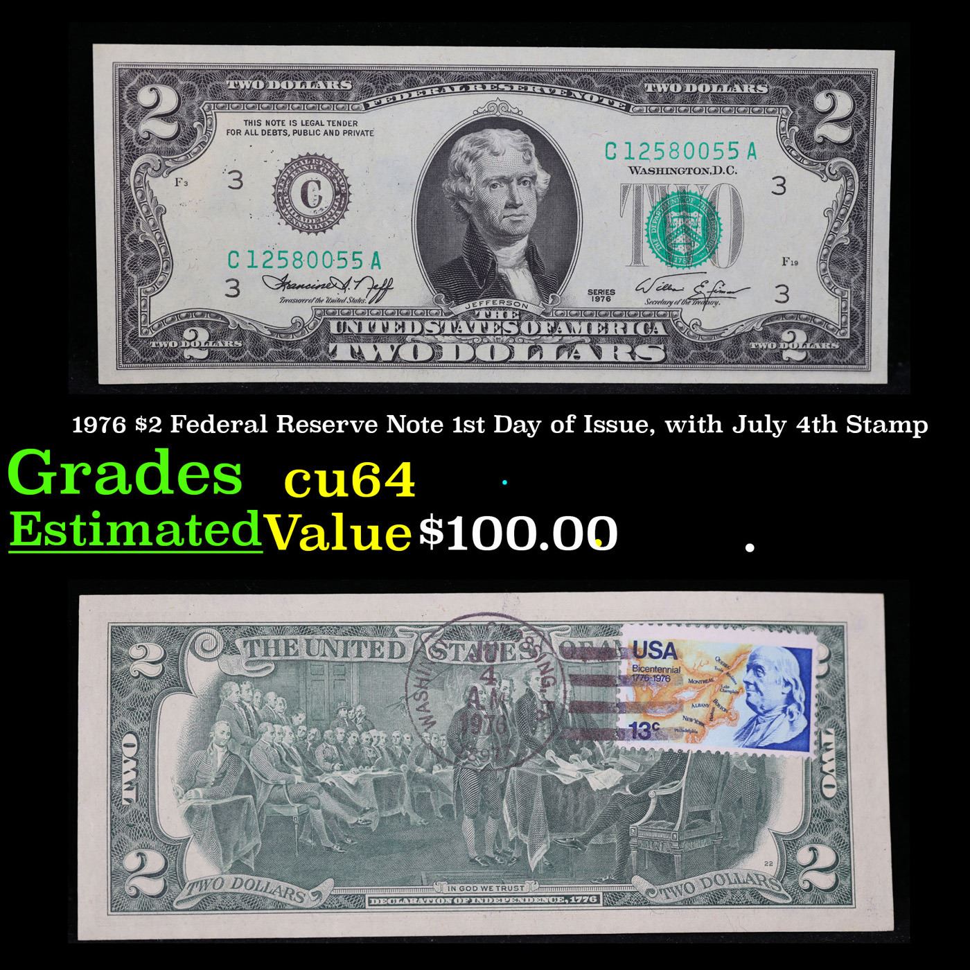 1976 $2 Federal Reserve Note 1st Day of Issue, with July 4th Stamp Grades Choice CU. On April 13, 1976, to celebrate the bicentennial of American independence, new $2 Federal Reserve Notes were issued with backs featuring the well-known painting Signing of the Declaration of Independence. These Notes have a 13c Stamp or 2 stamps totaling 13c hand canceled on July 4, 1976, the day of the bicentennial.