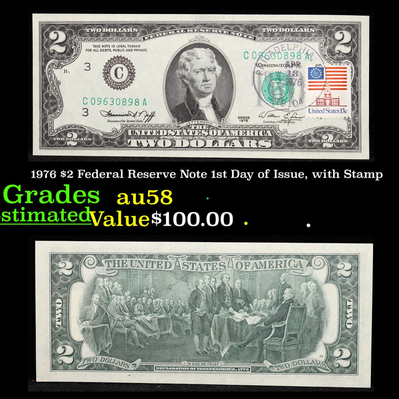 1976 $2 Federal Reserve Note 1st Day of Issue, with Stamp Grades Choice AU/BU Slider