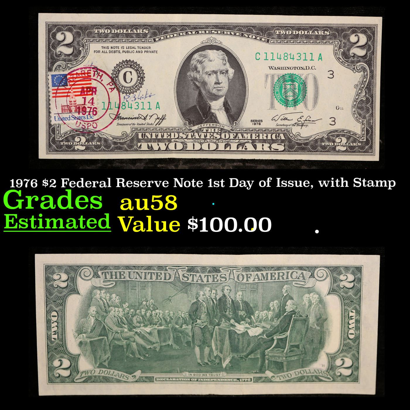 1976 $2 Federal Reserve Note 1st Day of Issue, with Stamp Grades Choice AU/BU Slider.