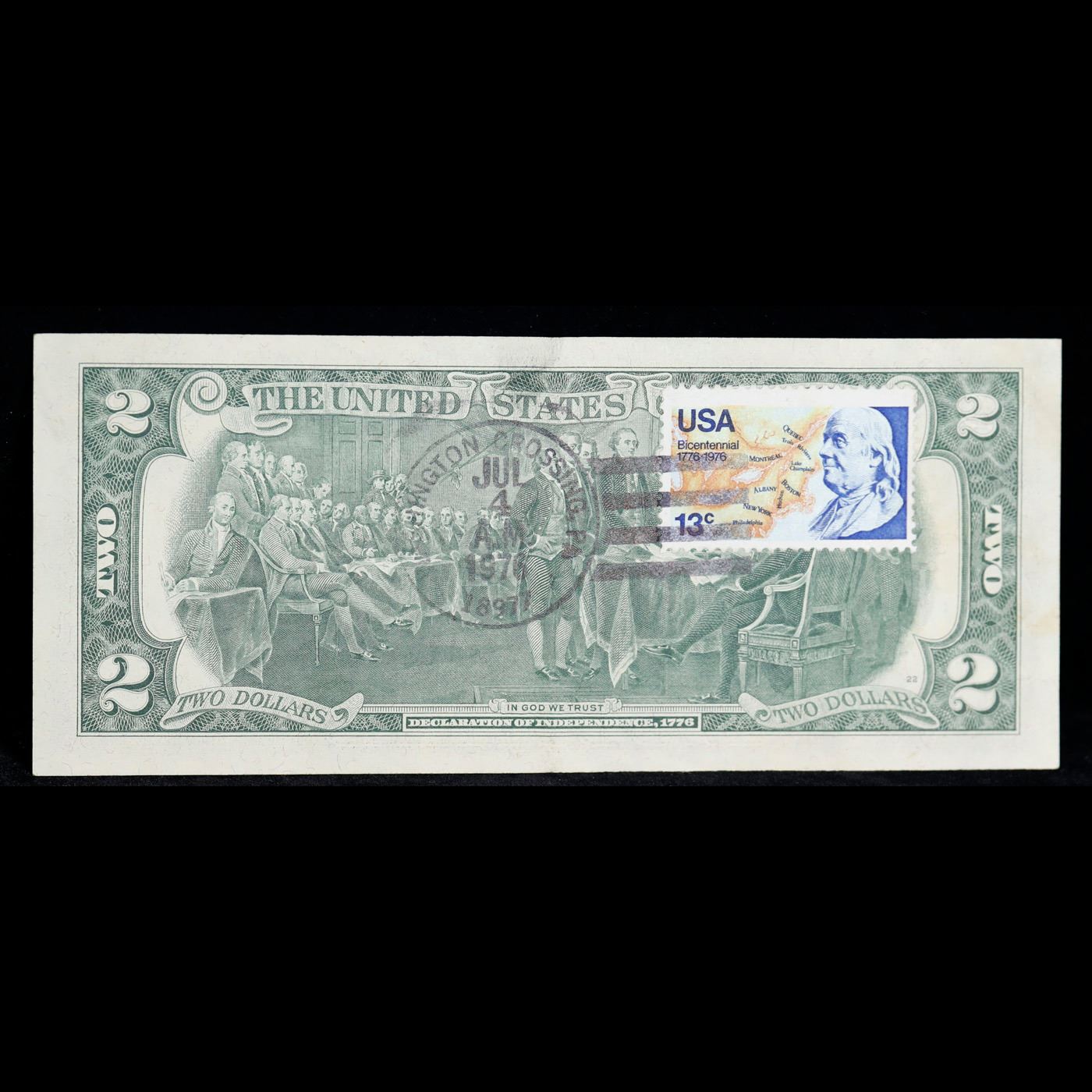 1976 $2 Federal Reserve Note 1st Day of Issue, with Stamp Grades Choice AU/BU Slider. On April 13, 1976, to celebrate the bicentennial of American independence, new $2 Federal Reserve Notes were issued with backs featuring the well-known painting Signing of the Declaration of Independence. These Notes all have a 13c Stamp or 2 stamps totaling 13c hand canceled on April 13, 1976 for the first day of issue of the new $2 notes. These official first-day-of-issue Bicentennial notes will be historic additions to your collection (designs and locations of the 13¢ stamps will vary).
