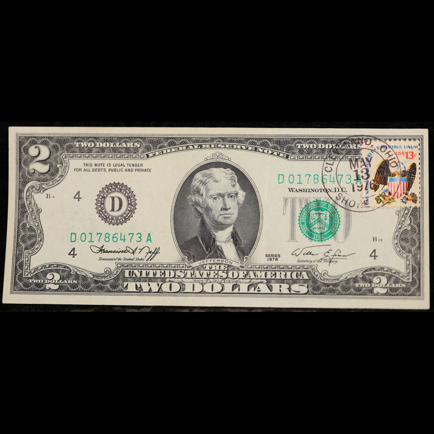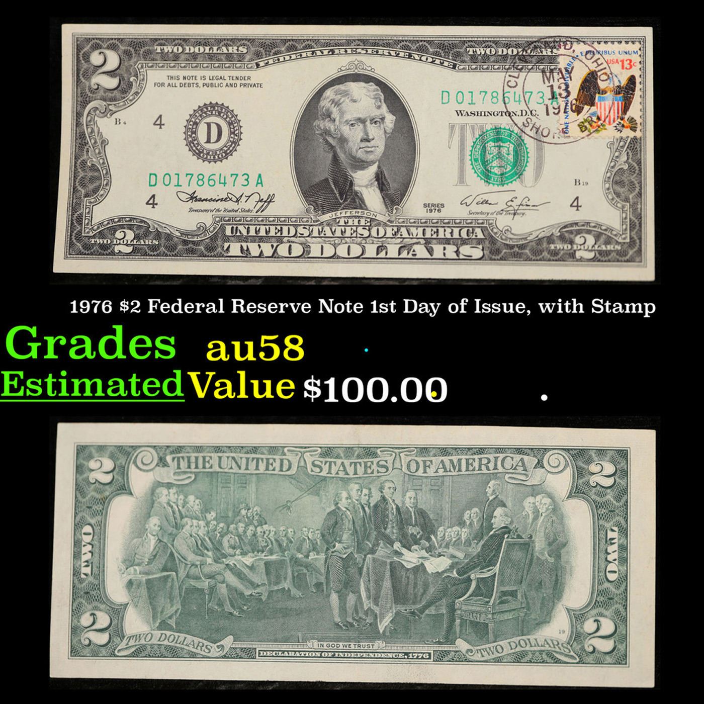 1976 $2 Federal Reserve Note 1st Day of Issue, with Stamp Grades Choice AU/BU Slider