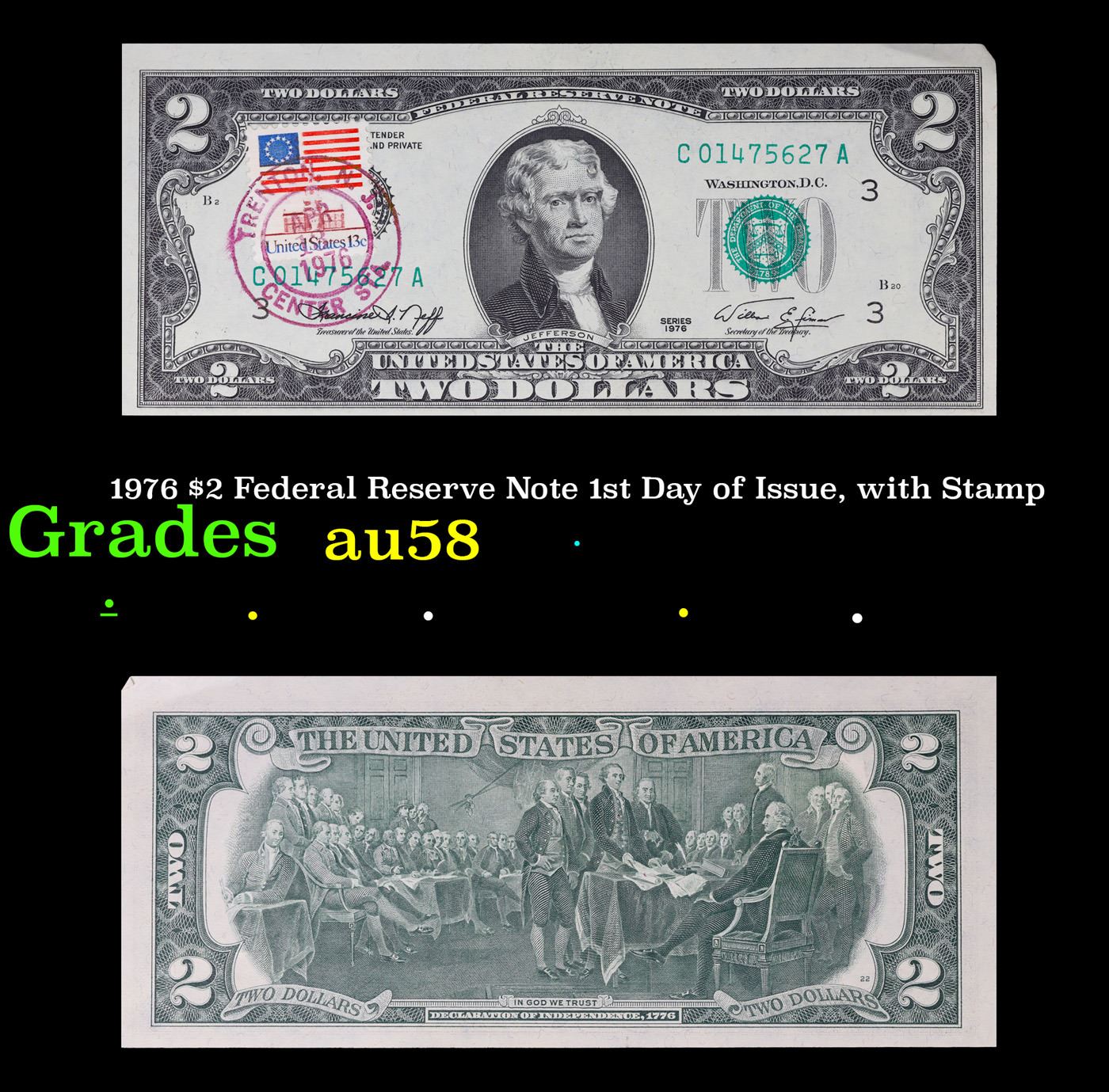 1976 $2 Federal Reserve Note 1st Day of Issue, with Stamp Grades Choice AU/BU Slider