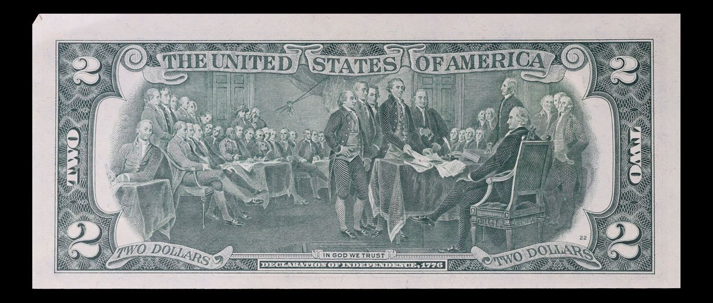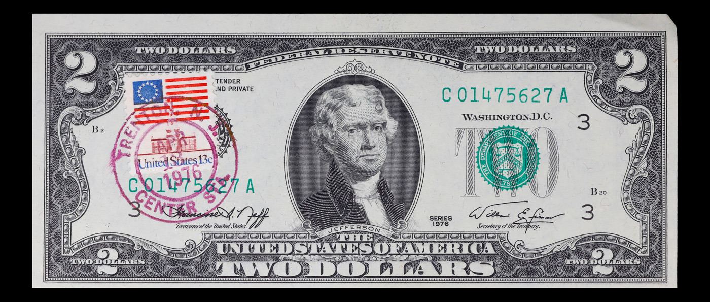 1976 $2 Federal Reserve Note 1st Day of Issue, with Stamp Grades Choice AU/BU Slider. On April 13, 1976, to celebrate the bicentennial of American independence, new $2 Federal Reserve Notes were issued with backs featuring the well-known painting Signing of the Declaration of Independence. These Notes all have a 13c Stamp or 2 stamps totaling 13c hand canceled on April 13, 1976 for the first day of issue of the new $2 notes. These official first-day-of-issue Bicentennial notes will be historic additions to your collection (designs and locations of the 13¢ stamps will vary).