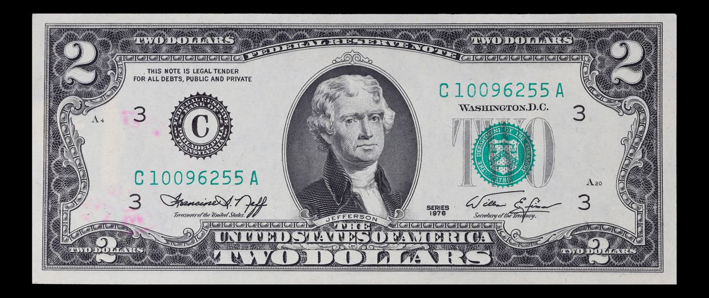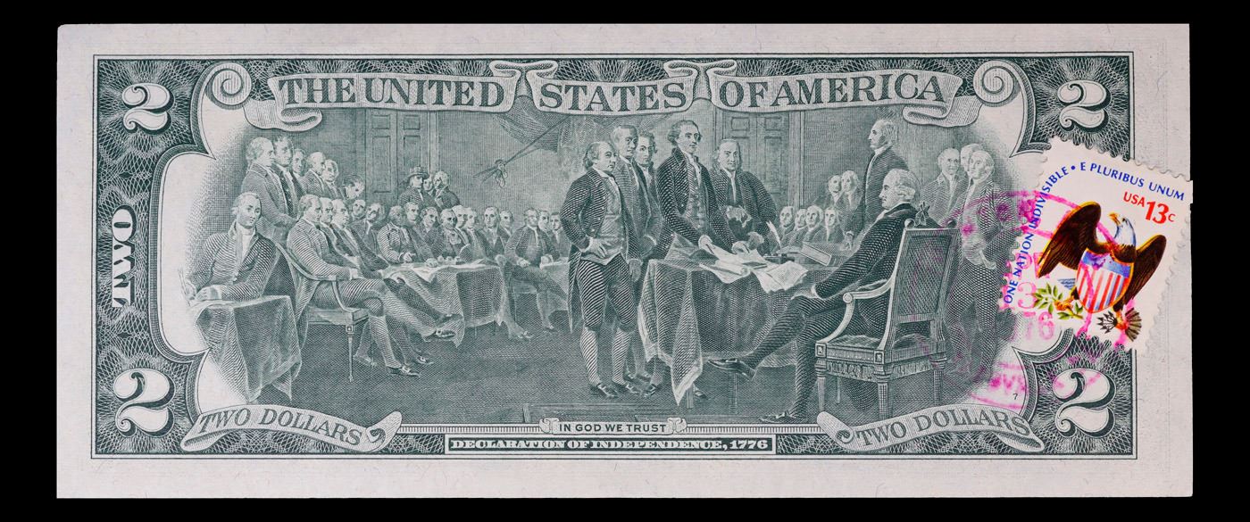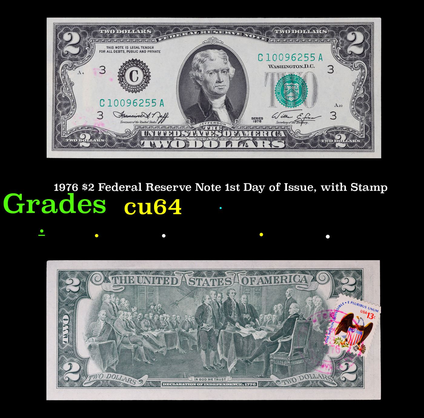 1976 $2 Federal Reserve Note 1st Day of Issue, with Stamp Grades Choice CU. On April 13, 1976, to celebrate the bicentennial of American independence, new $2 Federal Reserve Notes were issued with backs featuring the well-known painting Signing of the Declaration of Independence. These Notes all have a 13c Stamp or 2 stamps totaling 13c hand canceled on April 13, 1976 for the first day of issue of the new $2 notes. These official first-day-of-issue Bicentennial notes will be historic additions to your collection (designs and locations of the 13¢ stamps will vary).