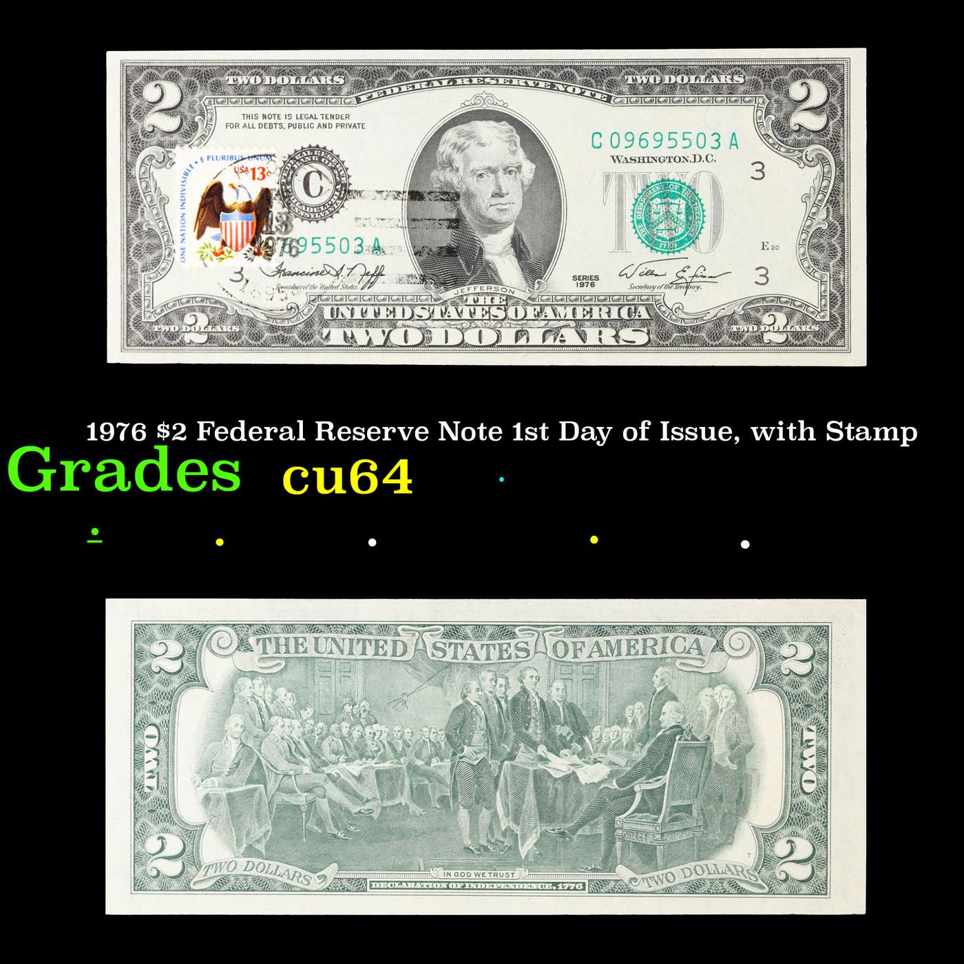 1976 $2 Federal Reserve Note 1st Day of Issue, with Stamp Grades Choice CU.