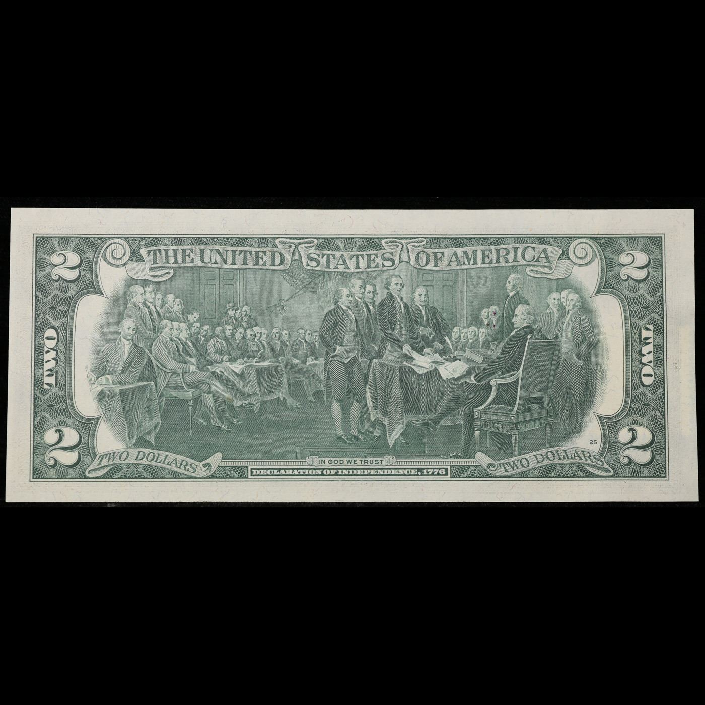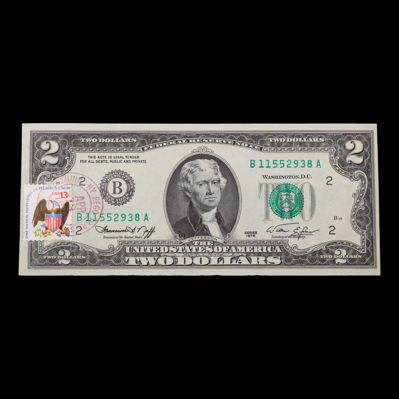 1976 $2 Federal Reserve Note 1st Day of Issue, with Stamp Grades Gem CU. On April 13, 1976, to celebrate the bicentennial of American independence, new $2 Federal Reserve Notes were issued with backs featuring the well-known painting Signing of the Declaration of Independence. These Notes all have a 13c Stamp or 2 stamps totaling 13c hand canceled on April 13, 1976 for the first day of issue of the new $2 notes. These official first-day-of-issue Bicentennial notes will be historic additions to your collection (designs and locations of the 13¢ stamps will vary).