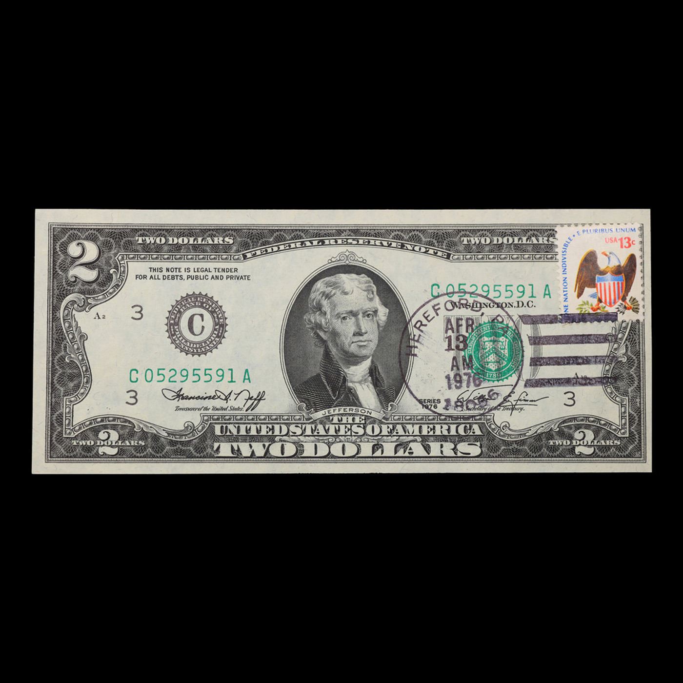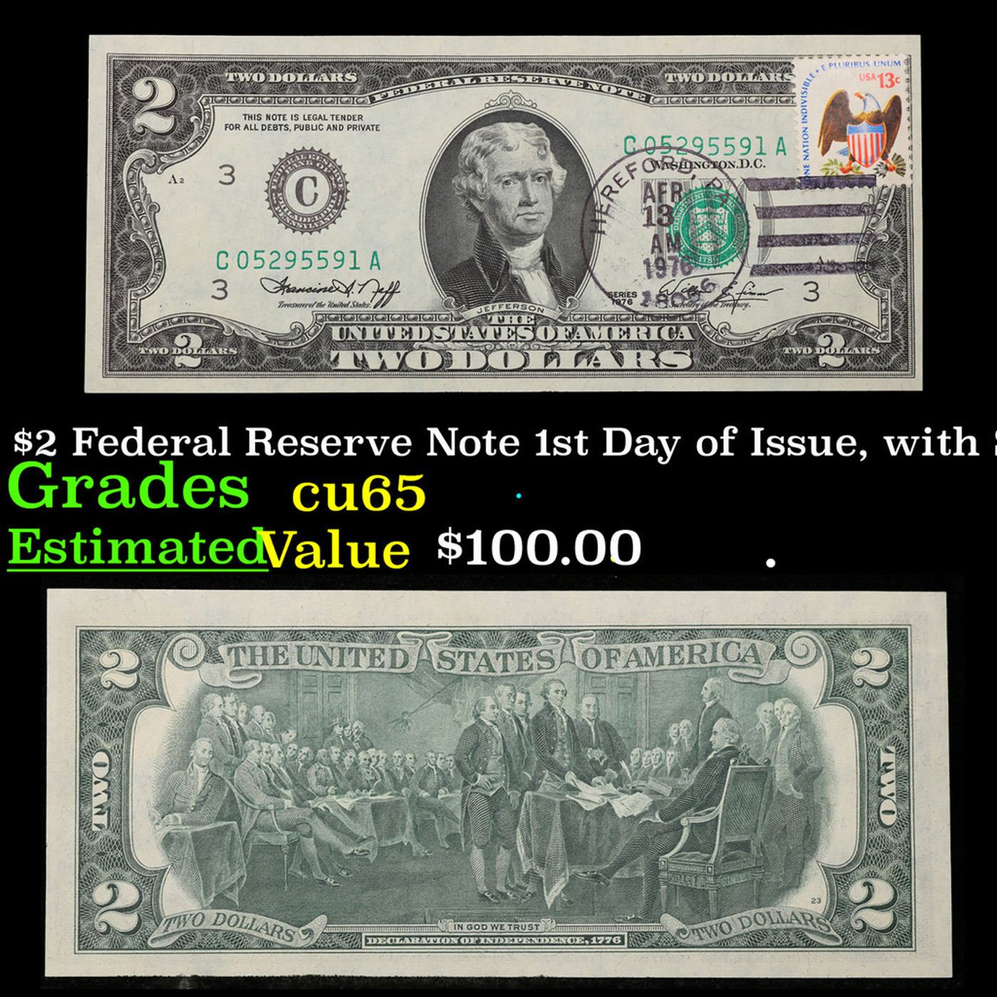 1976 $2 Federal Reserve Note 1st Day of Issue, with Stamp Grades Gem CU