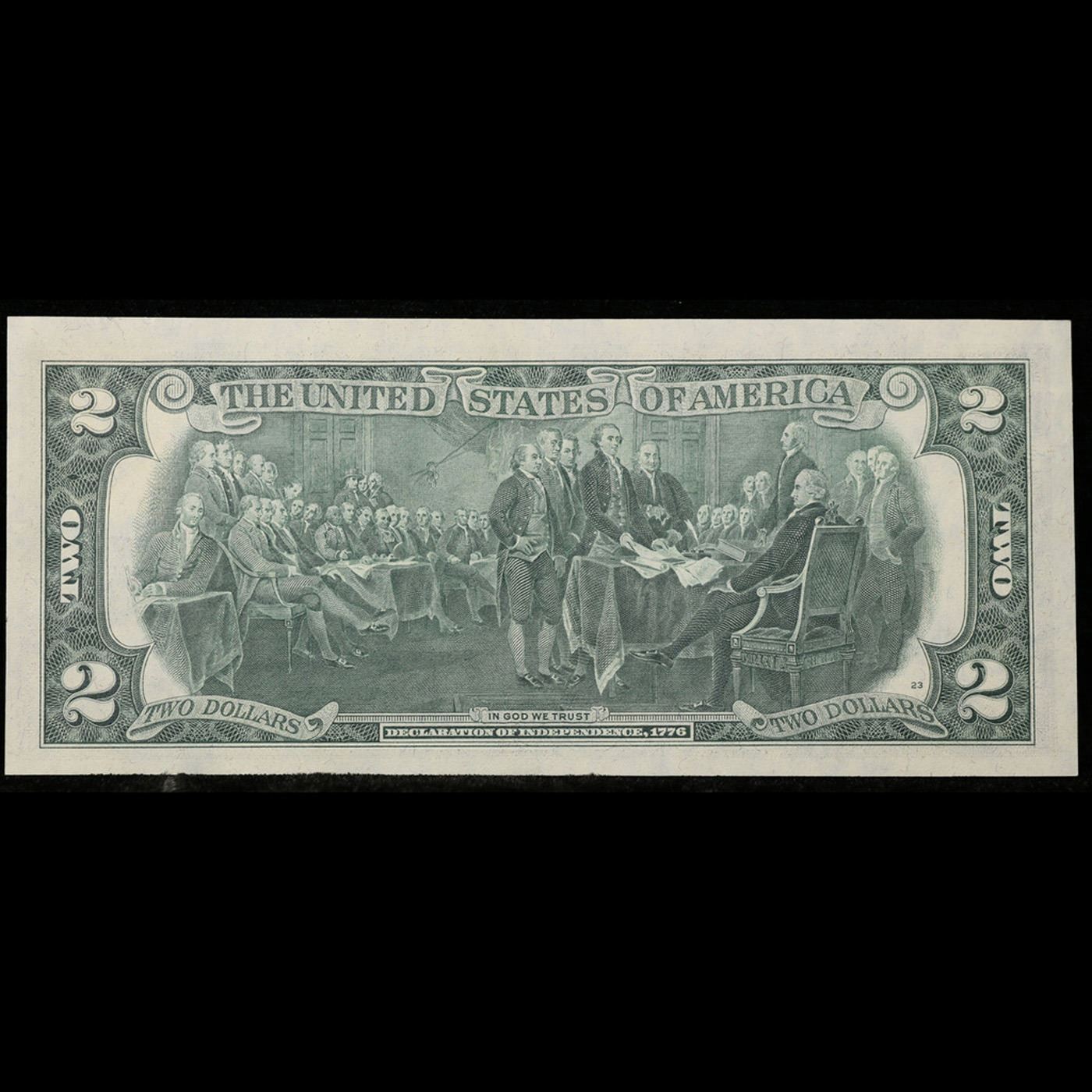 1976 $2 Federal Reserve Note 1st Day of Issue, with Stamp Grades Gem CU. On April 13, 1976, to celebrate the bicentennial of American independence, new $2 Federal Reserve Notes were issued with backs featuring the well-known painting Signing of the Declaration of Independence. These Notes all have a 13c Stamp or 2 stamps totaling 13c hand canceled on April 13, 1976 for the first day of issue of the new $2 notes. These official first-day-of-issue Bicentennial notes will be historic additions to your collection (designs and locations of the 13¢ stamps will vary).