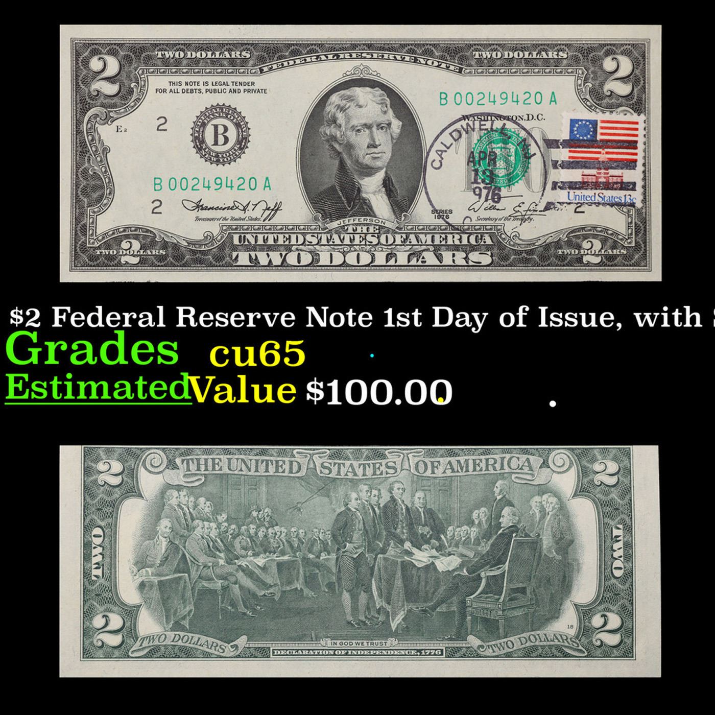 1976 $2 Federal Reserve Note 1st Day of Issue, with Stamp Grades Gem CU