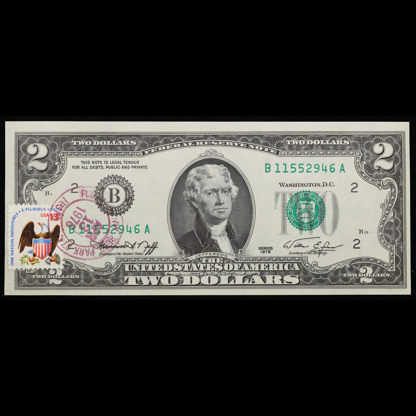 1976 $2 Federal Reserve Note 1st Day of Issue, with Stamp Grades Gem CU