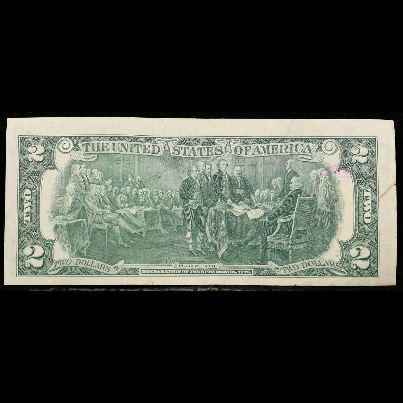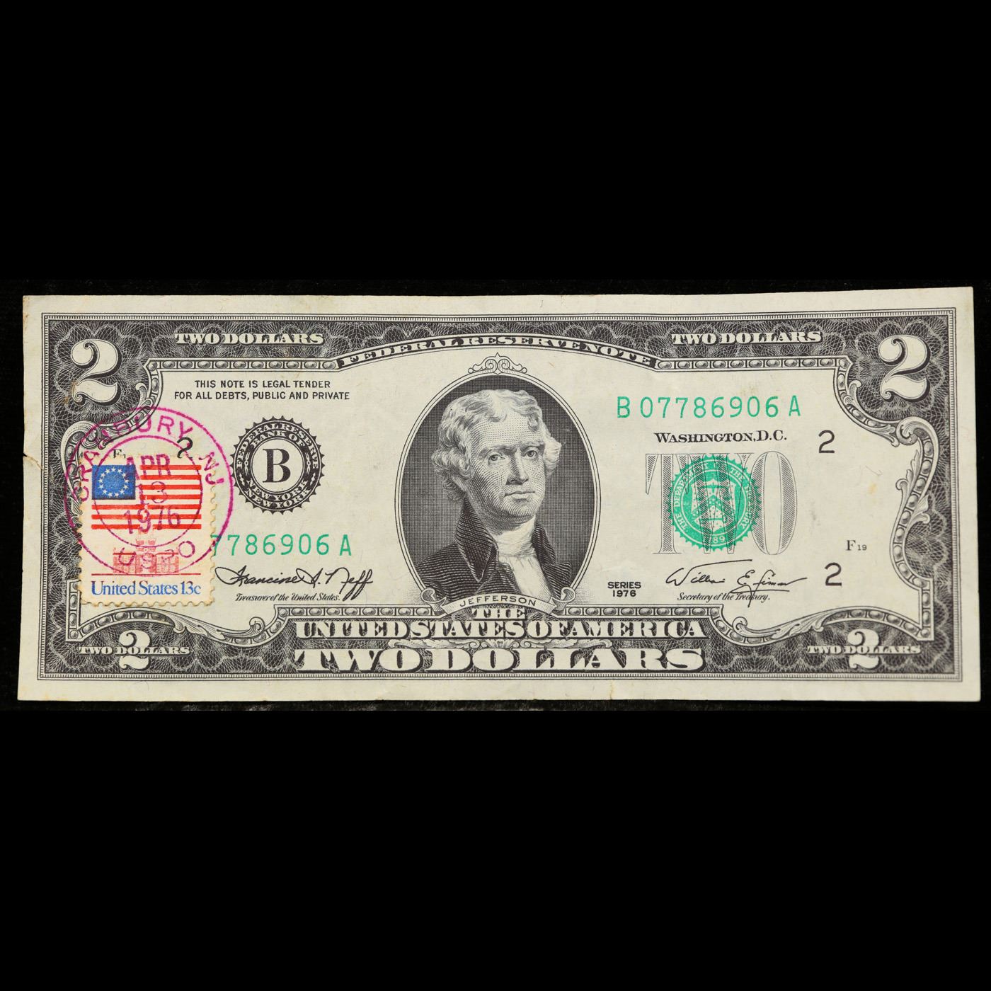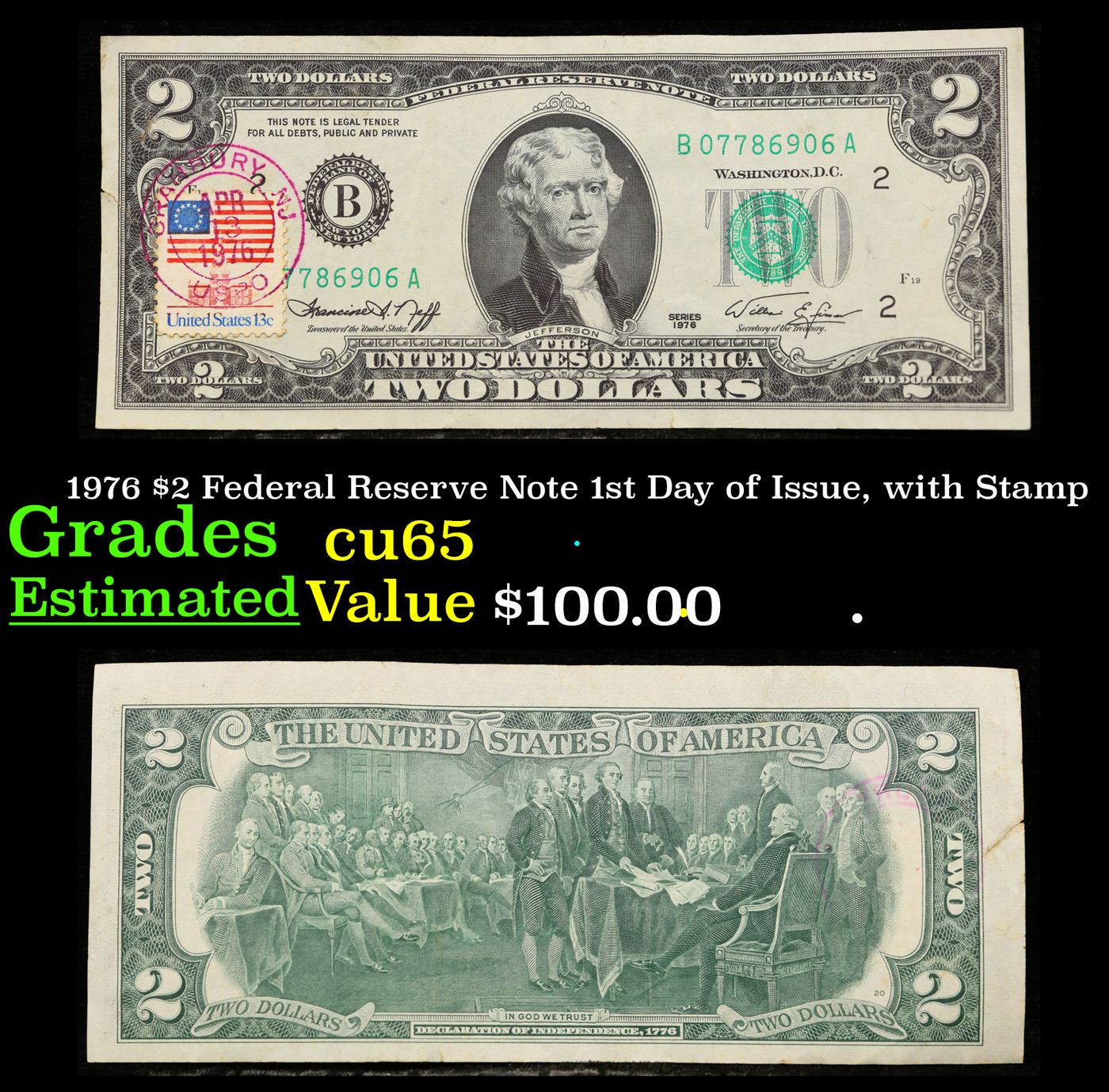 1976 $2 Federal Reserve Note 1st Day of Issue, with Stamp Grades Gem CU. On April 13, 1976, to celebrate the bicentennial of American independence, new $2 Federal Reserve Notes were issued with backs featuring the well-known painting Signing of the Declaration of Independence. These Notes all have a 13c Stamp or 2 stamps totaling 13c hand canceled on April 13, 1976 for the first day of issue of the new $2 notes. These official first-day-of-issue Bicentennial notes will be historic additions to your collection (designs and locations of the 13¢ stamps will vary).
