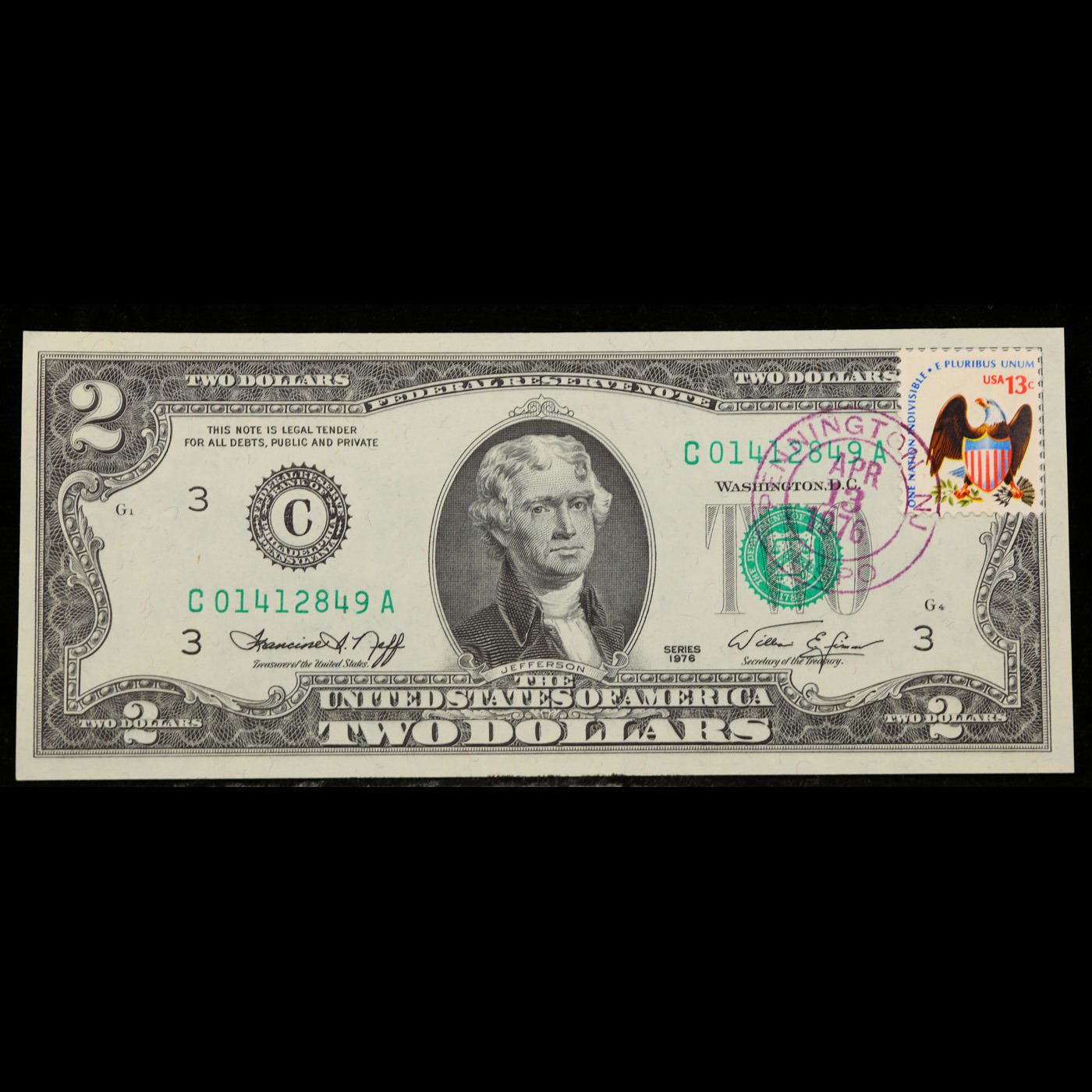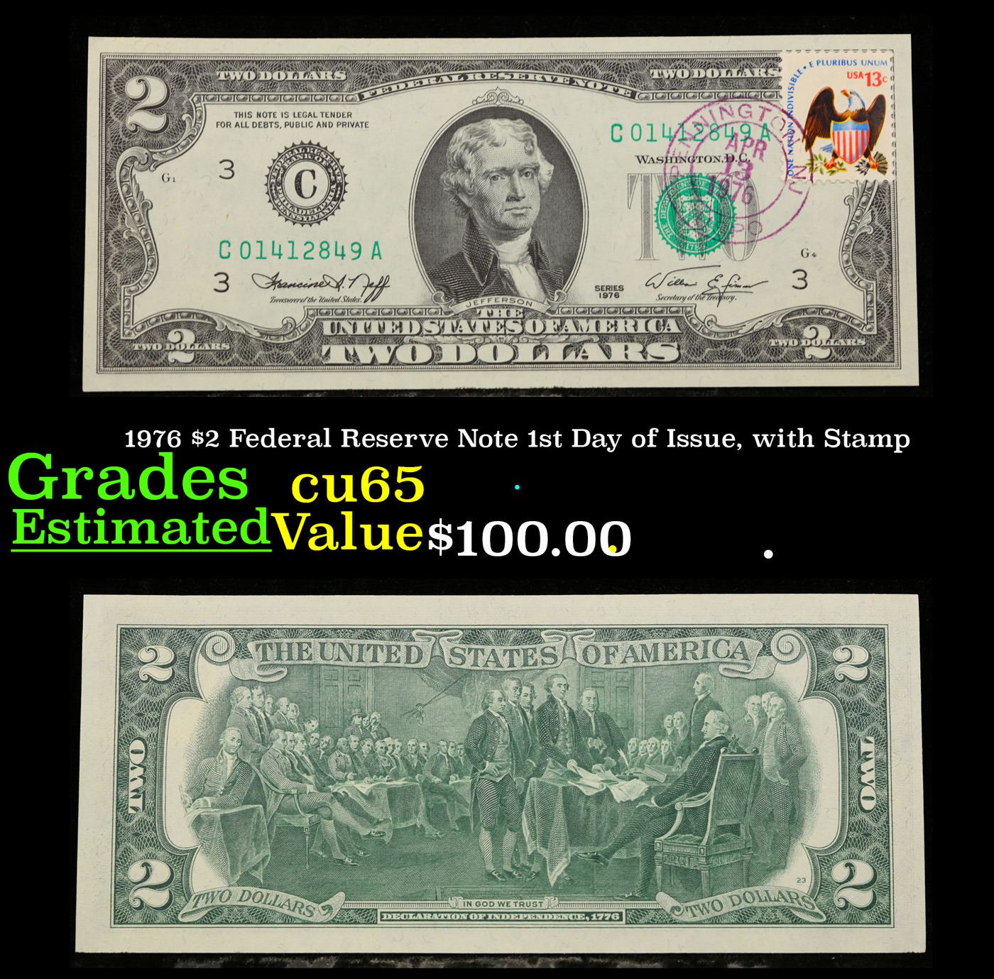 1976 $2 Federal Reserve Note 1st Day of Issue, with Stamp Grades Gem CU