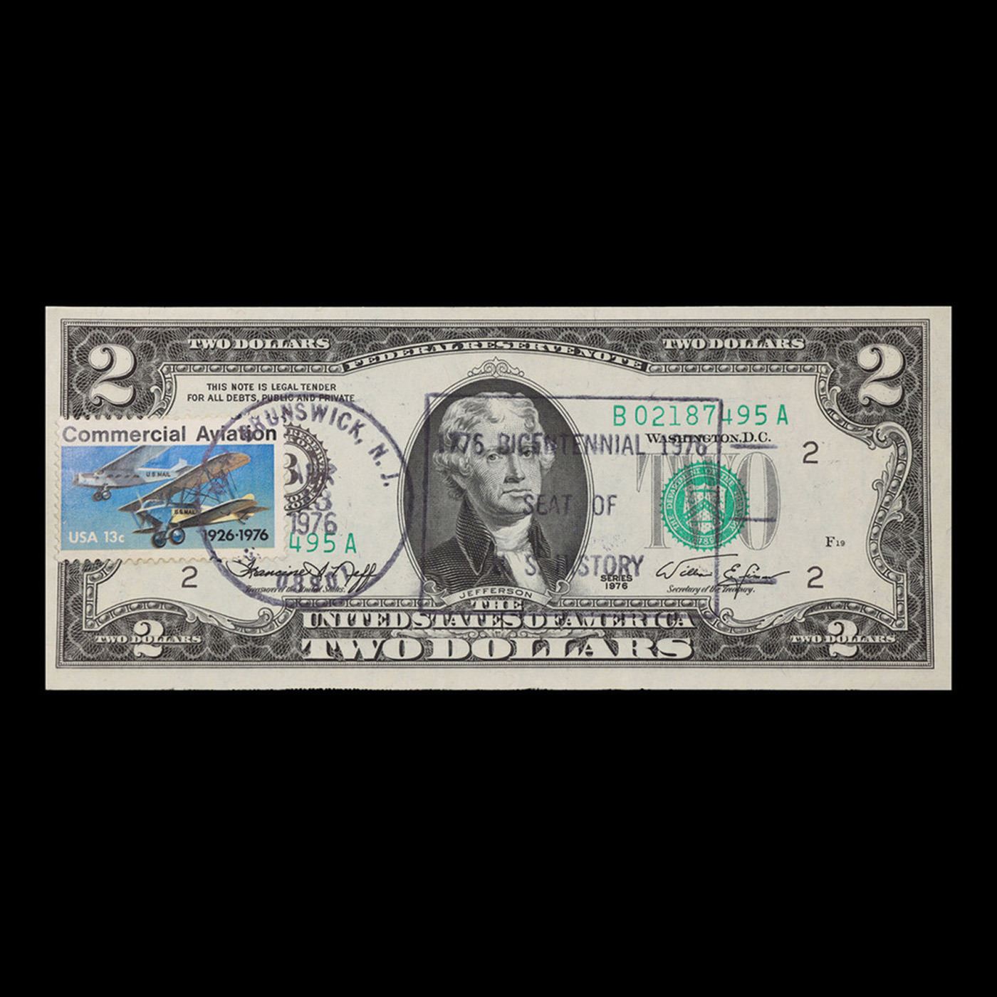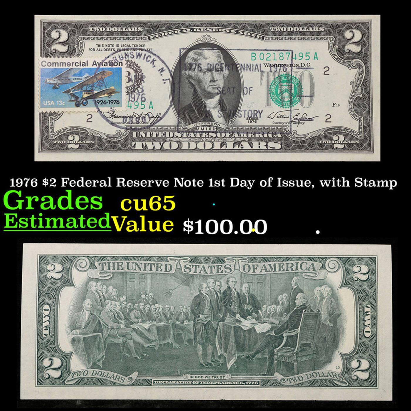 1976 $2 Federal Reserve Note 1st Day of Issue, with Stamp Grades Gem CU