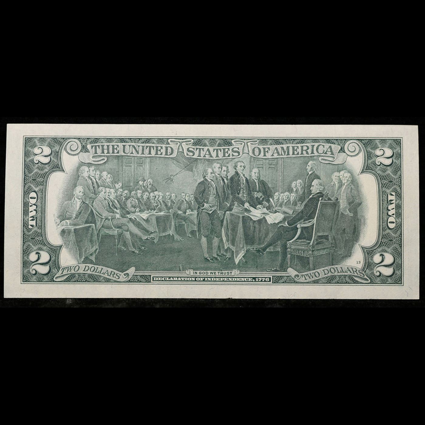 1976 $2 Federal Reserve Note 1st Day of Issue, with Stamp Grades Gem CU. On April 13, 1976, to celebrate the bicentennial of American independence, new $2 Federal Reserve Notes were issued with backs featuring the well-known painting Signing of the Declaration of Independence. These Notes all have a 13c Stamp or 2 stamps totaling 13c hand canceled on April 13, 1976 for the first day of issue of the new $2 notes. These official first-day-of-issue Bicentennial notes will be historic additions to your collection (designs and locations of the 13¢ stamps will vary).