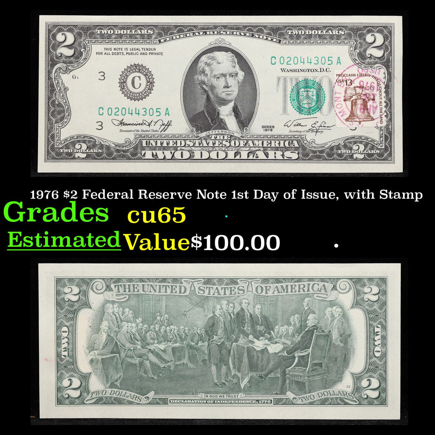 1976 $2 Federal Reserve Note 1st Day of Issue, with Stamp Grades Gem CU