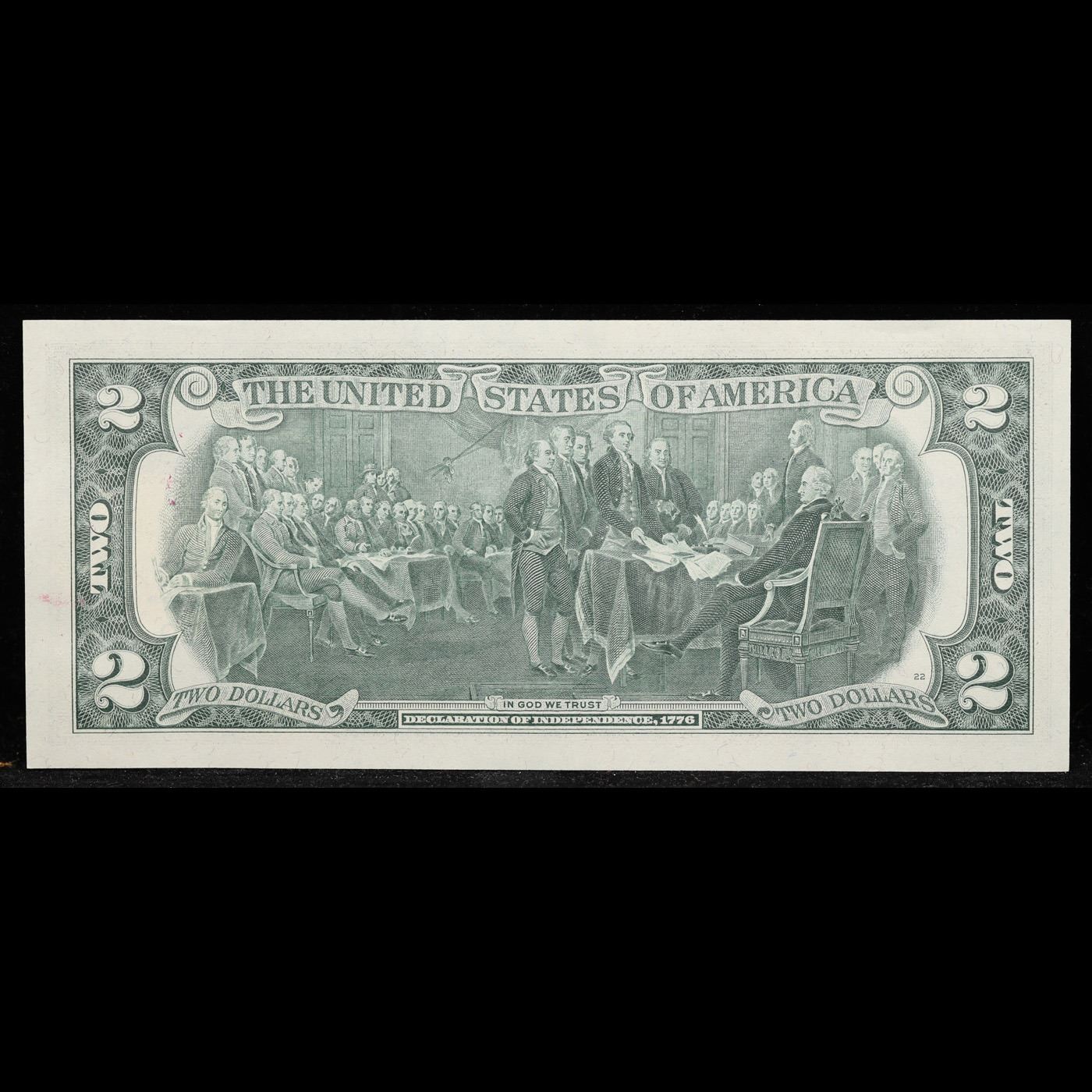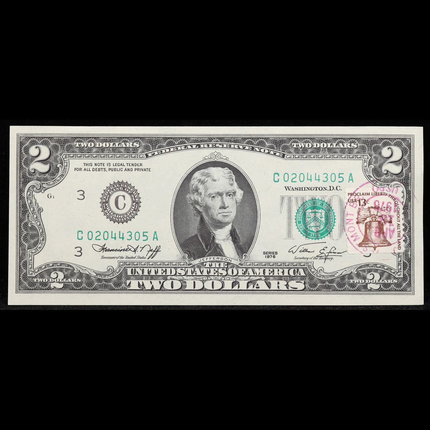 1976 $2 Federal Reserve Note 1st Day of Issue, with Stamp Grades Gem CU. On April 13, 1976, to celebrate the bicentennial of American independence, new $2 Federal Reserve Notes were issued with backs featuring the well-known painting Signing of the Declaration of Independence. These Notes all have a 13c Stamp or 2 stamps totaling 13c hand canceled on April 13, 1976 for the first day of issue of the new $2 notes. These official first-day-of-issue Bicentennial notes will be historic additions to your collection (designs and locations of the 13¢ stamps will vary).
