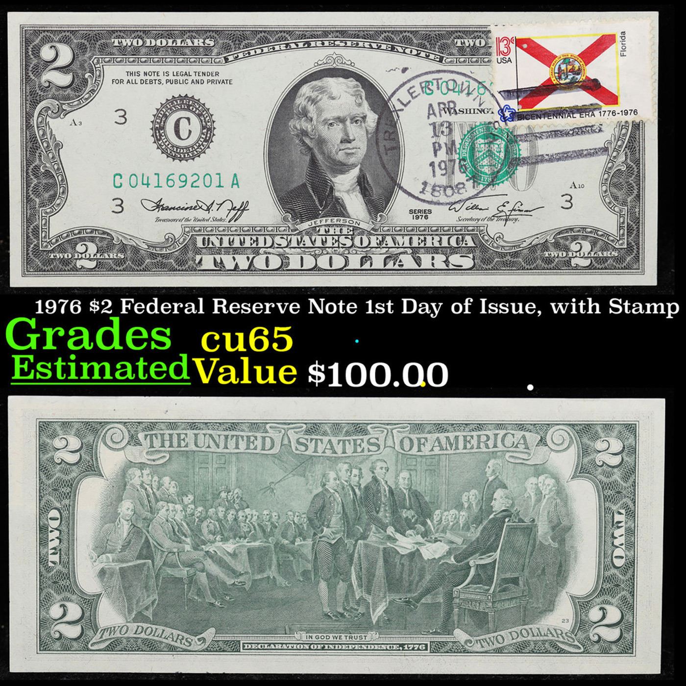 1976 $2 Federal Reserve Note 1st Day of Issue, with Stamp Grades Gem CU.
