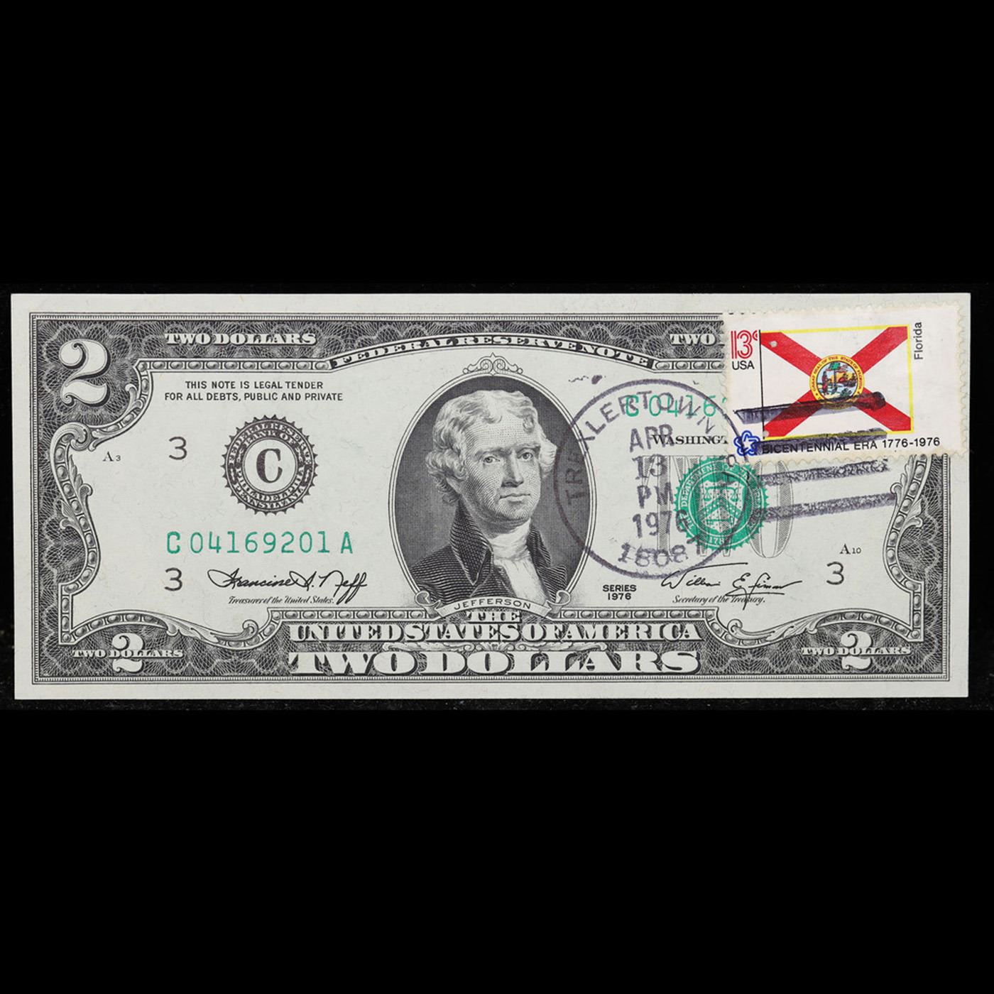 1976 $2 Federal Reserve Note 1st Day of Issue, with Stamp Grades Gem CU
