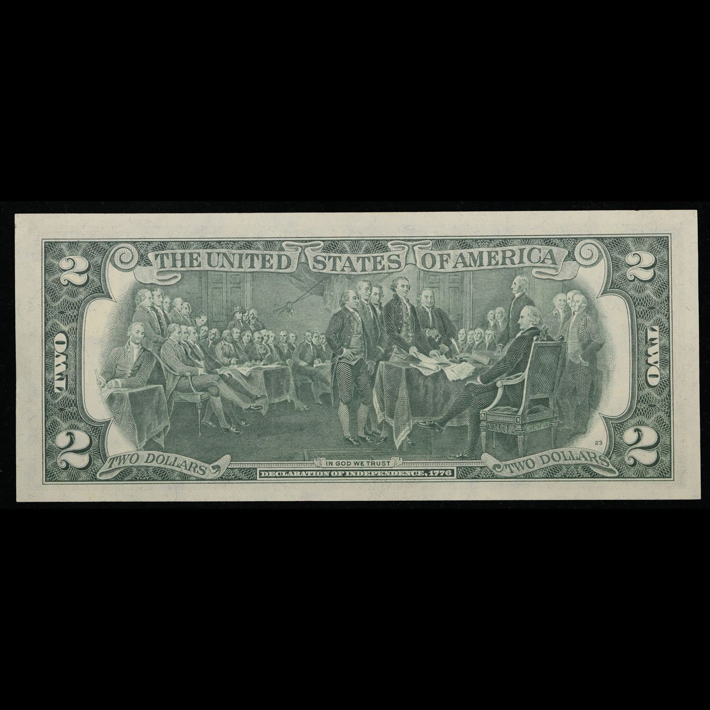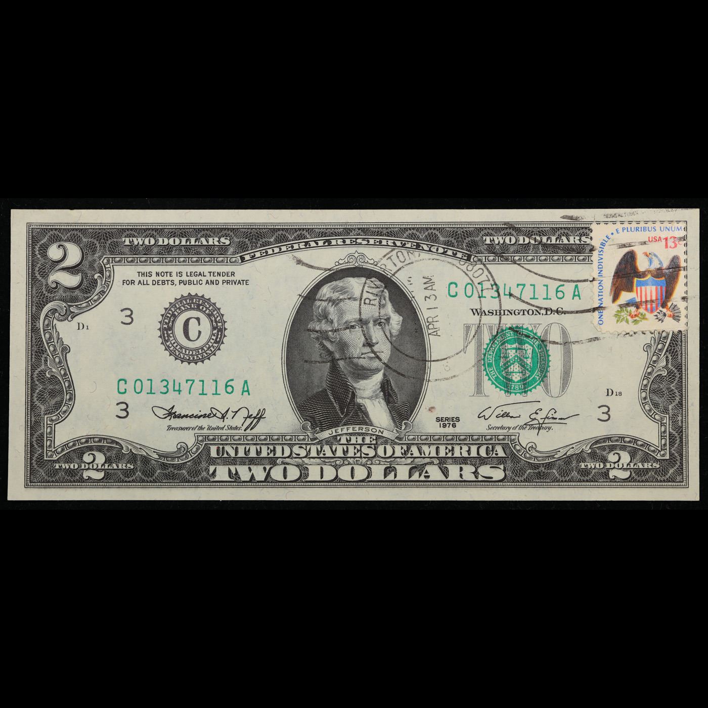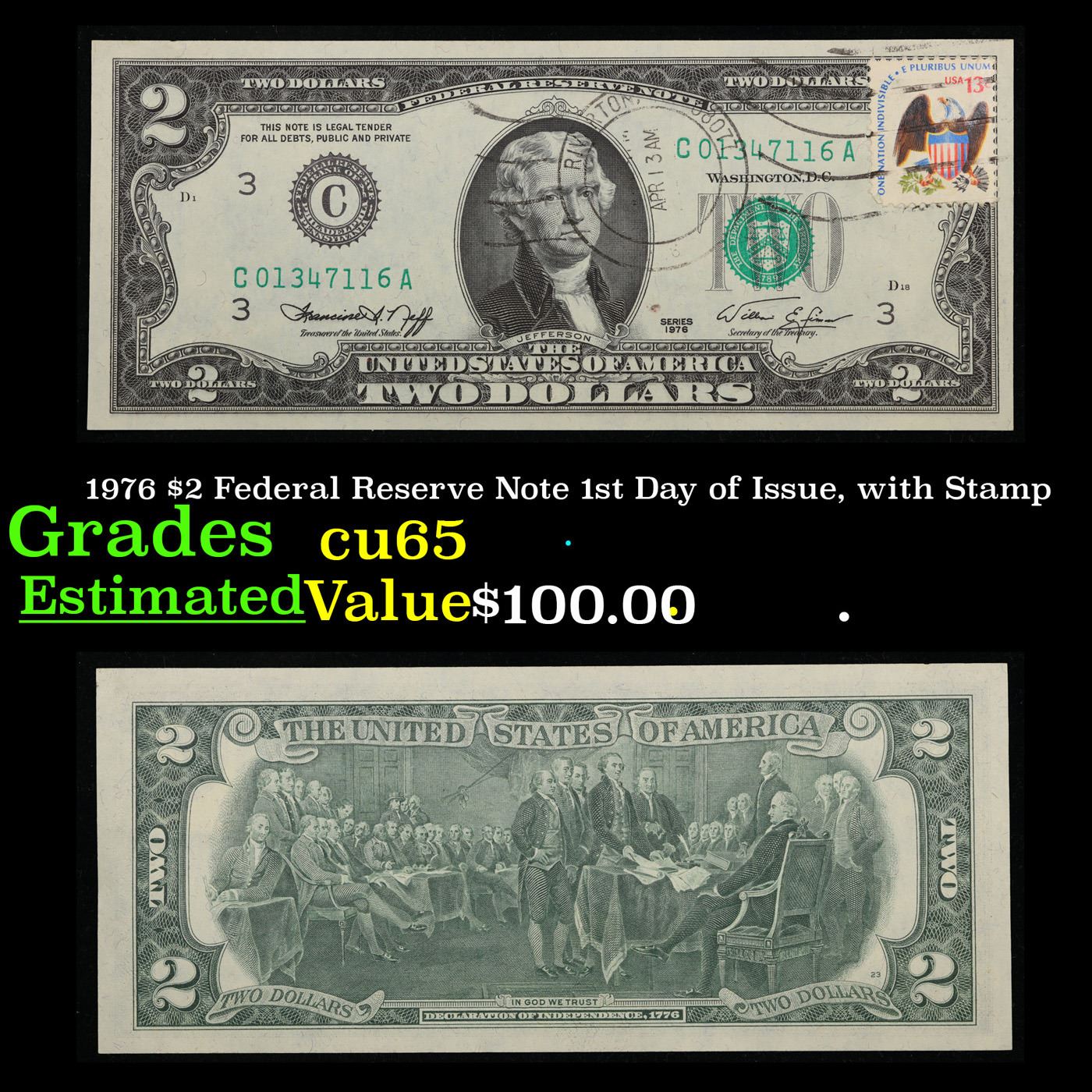 1976 $2 Federal Reserve Note 1st Day of Issue, with Stamp Grades Gem CU. On April 13, 1976, to celebrate the bicentennial of American independence, new $2 Federal Reserve Notes were issued with backs featuring the well-known painting Signing of the Declaration of Independence. These Notes all have a 13c Stamp or 2 stamps totaling 13c hand canceled on April 13, 1976 for the first day of issue of the new $2 notes. These official first-day-of-issue Bicentennial notes will be historic additions to your collection (designs and locations of the 13¢ stamps will vary).