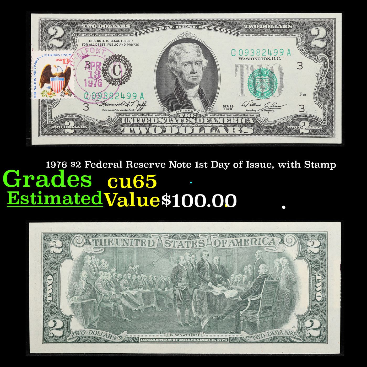 1976 $2 Federal Reserve Note 1st Day of Issue, with Stamp Grades Gem CU