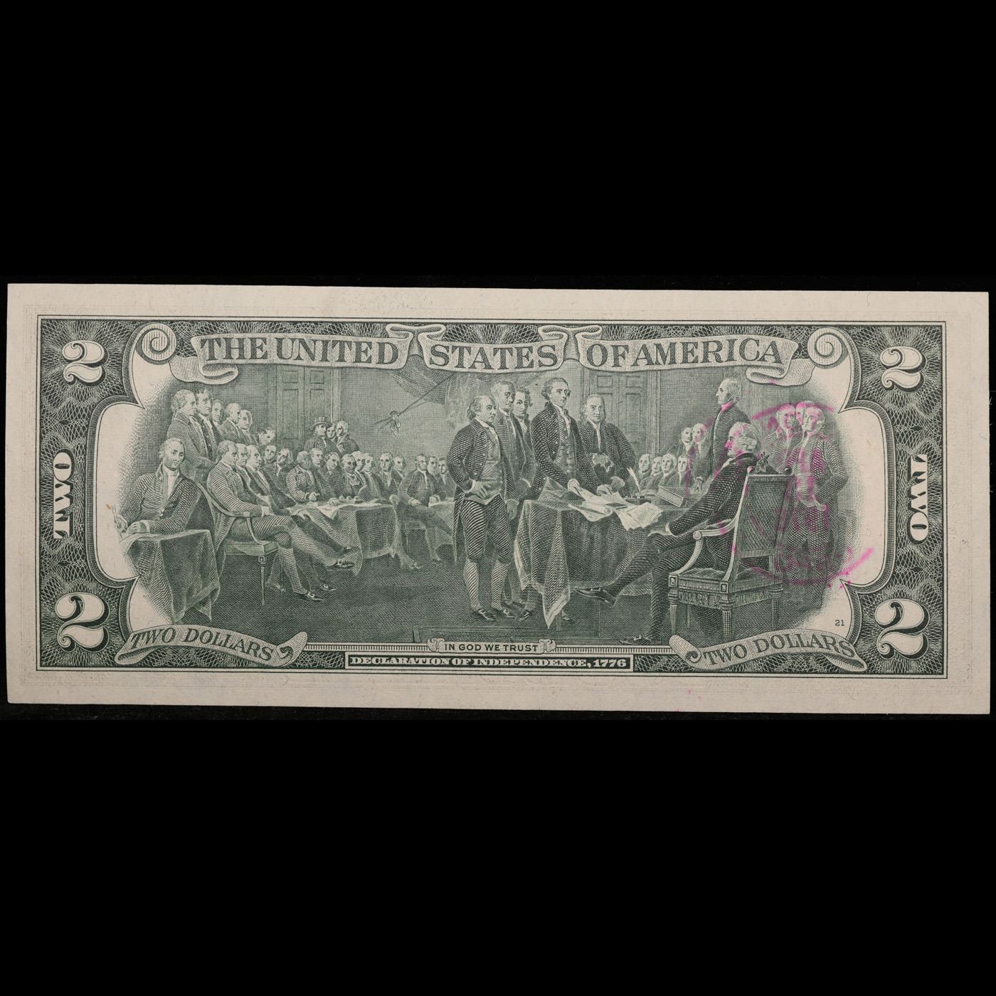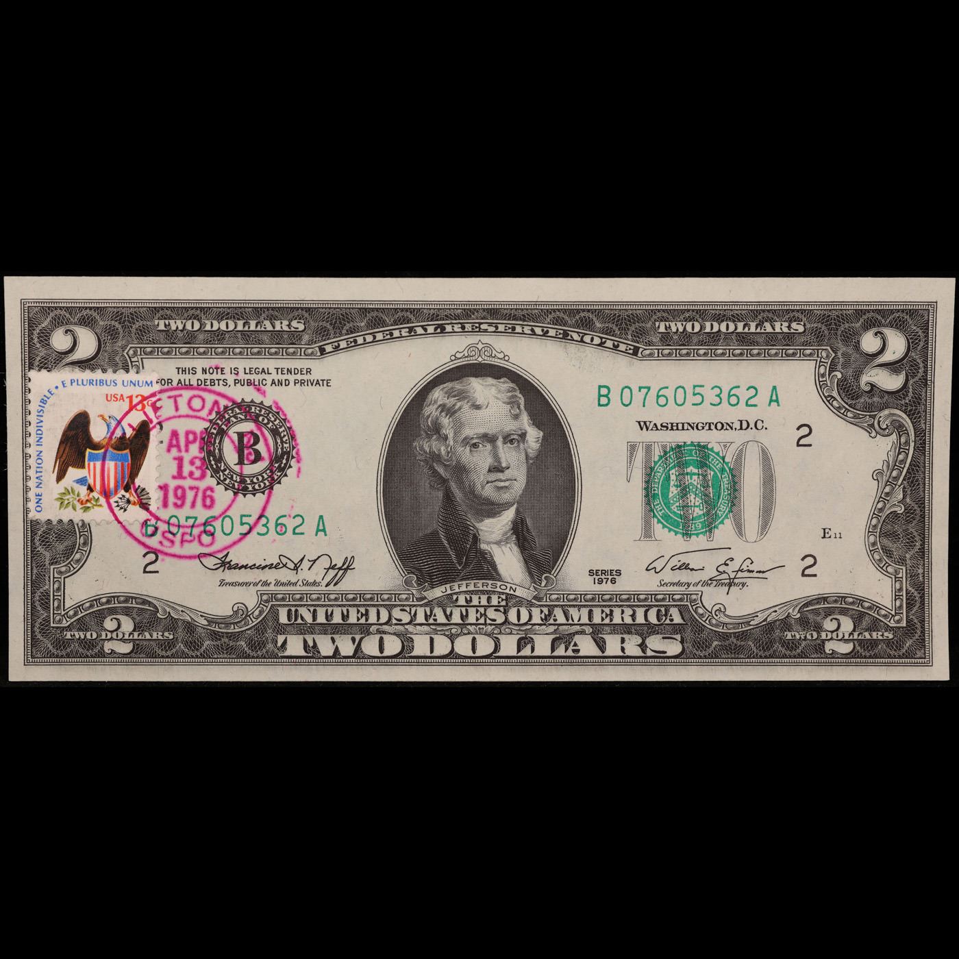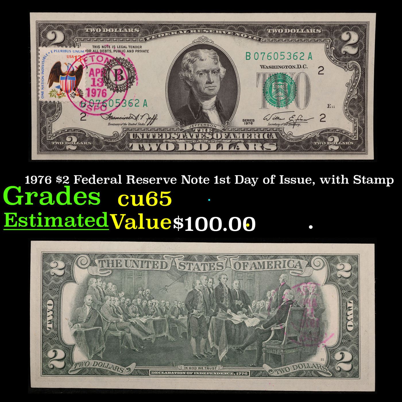 1976 $2 Federal Reserve Note 1st Day of Issue, with Stamp Grades Gem CU