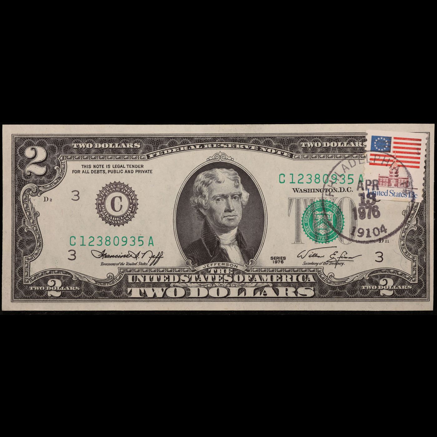 1976 $2 Federal Reserve Note 1st Day of Issue, with Stamp Grades Gem CU