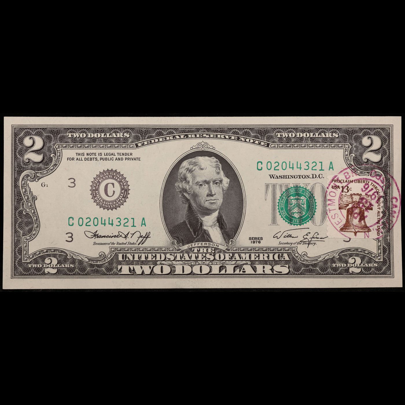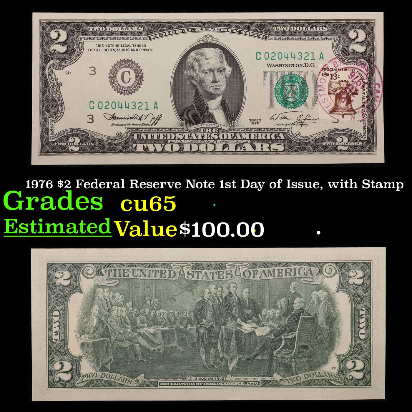 1976 $2 Federal Reserve Note 1st Day of Issue, with Stamp Grades Gem CU
