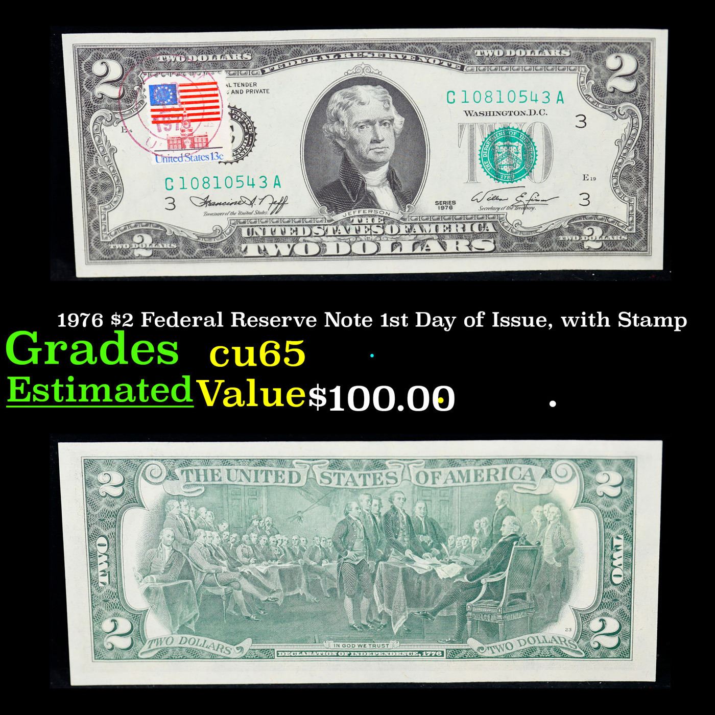 1976 $2 Federal Reserve Note 1st Day of Issue, with Stamp Grades Gem CU