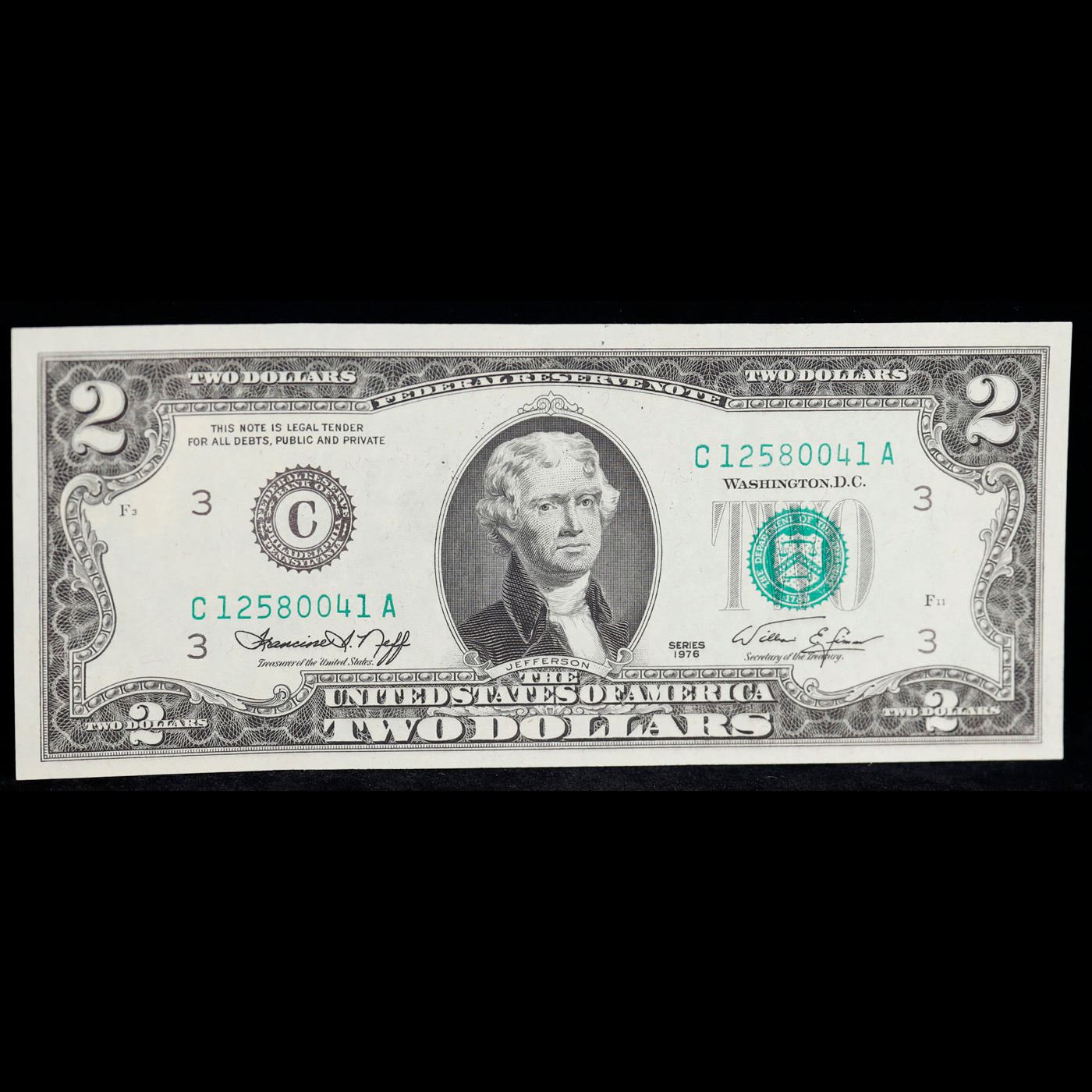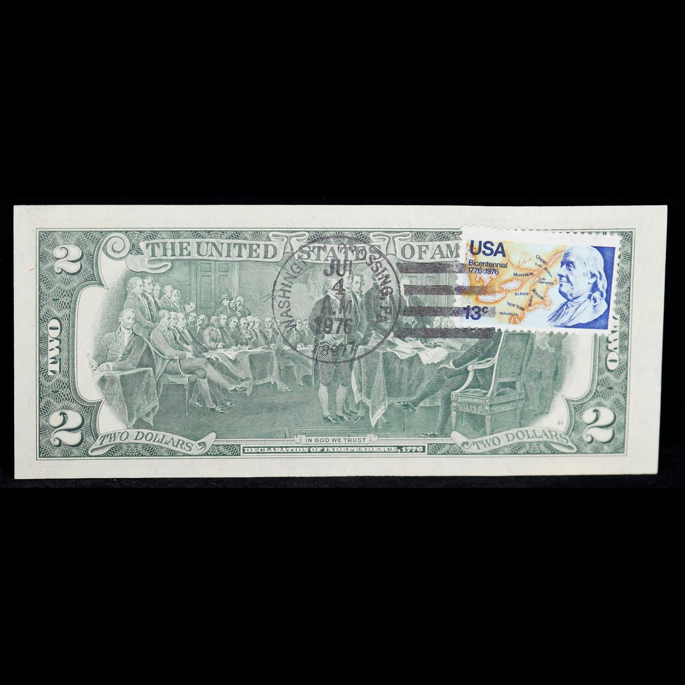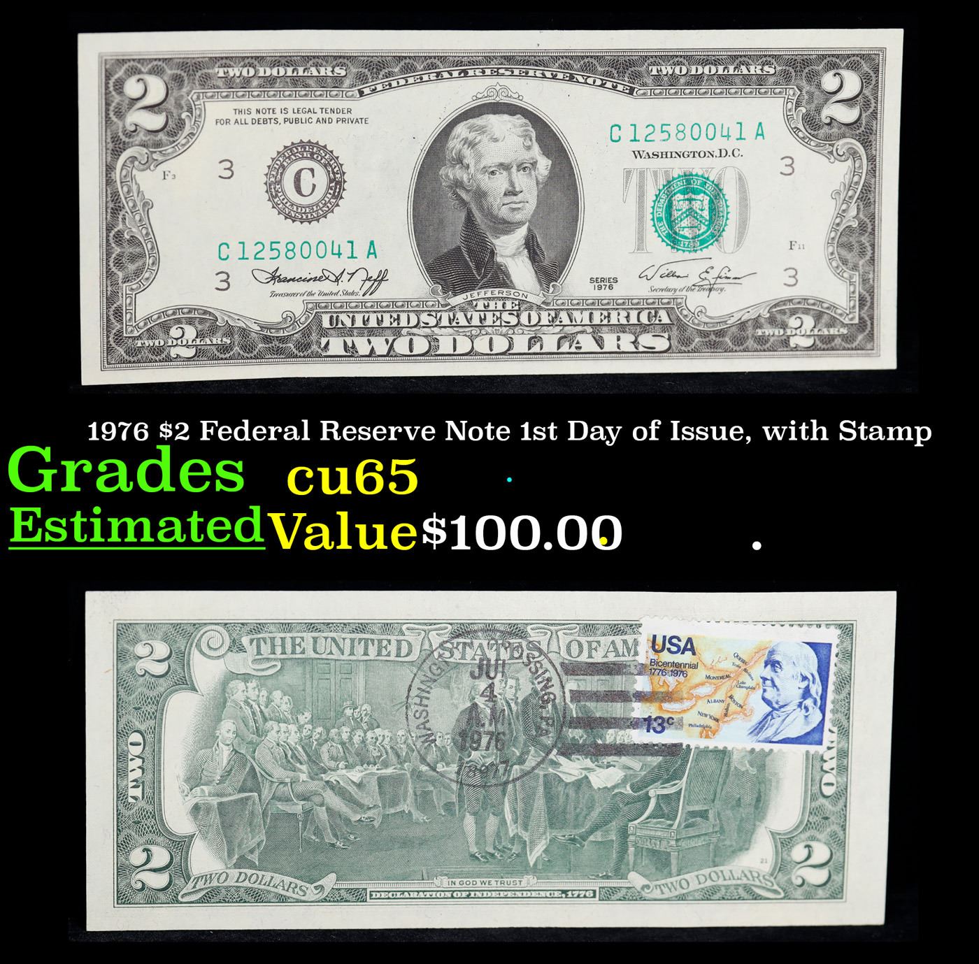 1976 $2 Federal Reserve Note 1st Day of Issue, with Stamp Grades Gem CU