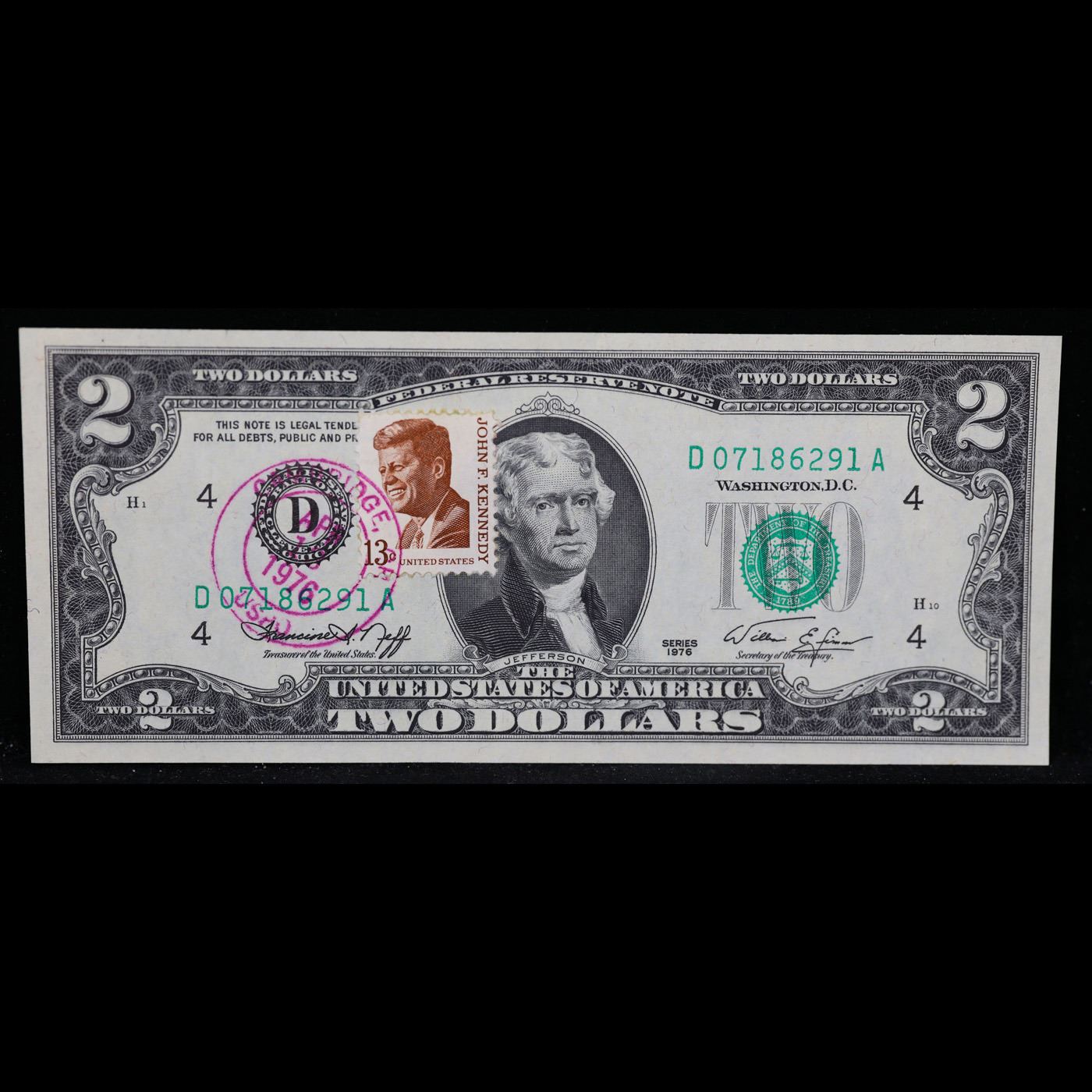 1976 $2 Federal Reserve Note 1st Day of Issue, with Stamp Grades Gem CU