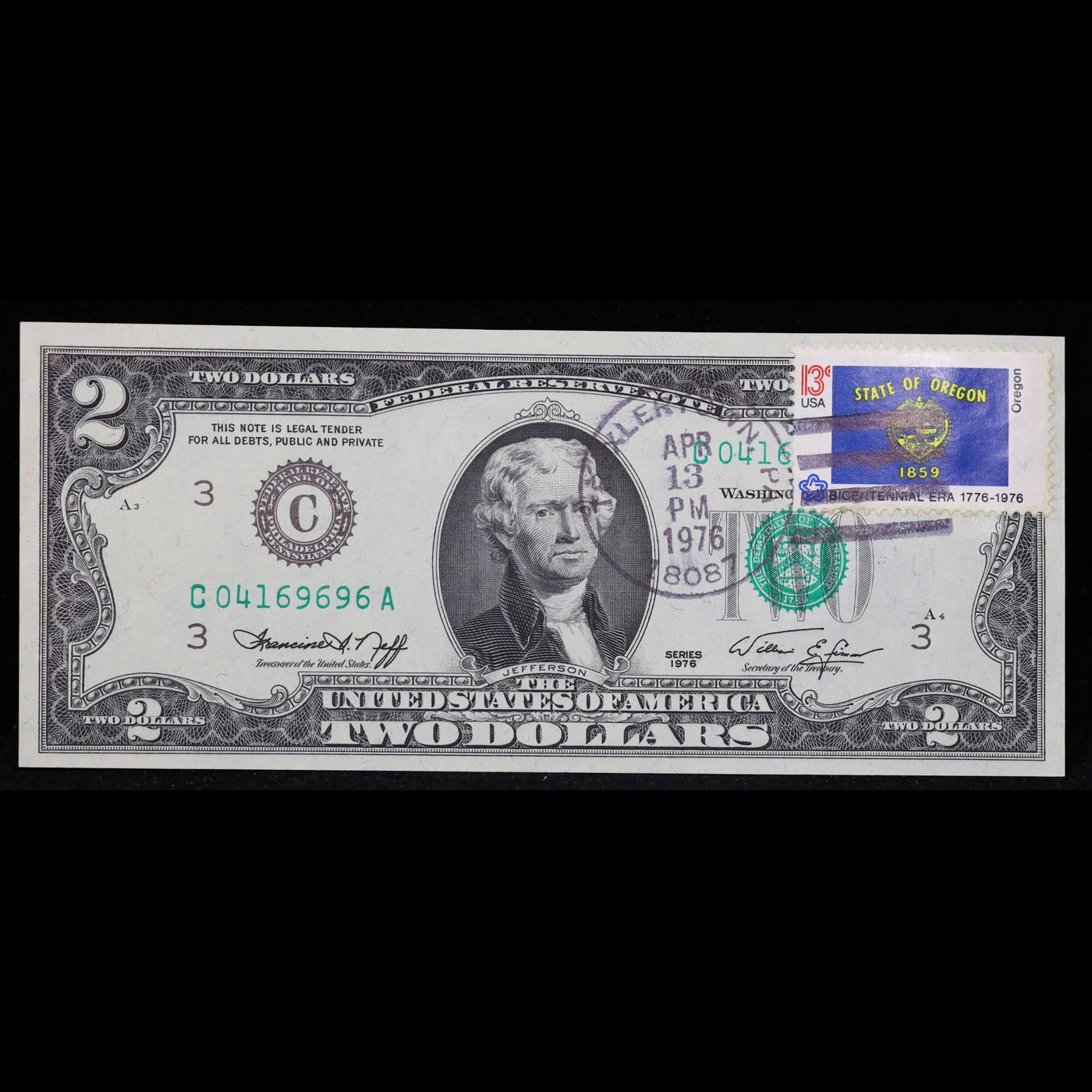 1976 $2 Federal Reserve Note 1st Day of Issue, with Stamp Grades Gem CU. On April 13, 1976, to celebrate the bicentennial of American independence, new $2 Federal Reserve Notes were issued with backs featuring the well-known painting Signing of the Declaration of Independence. These Notes all have a 13c Stamp or 2 stamps totaling 13c hand canceled on April 13, 1976 for the first day of issue of the new $2 notes. These official first-day-of-issue Bicentennial notes will be historic additions to your collection (designs and locations of the 13¢ stamps will vary).