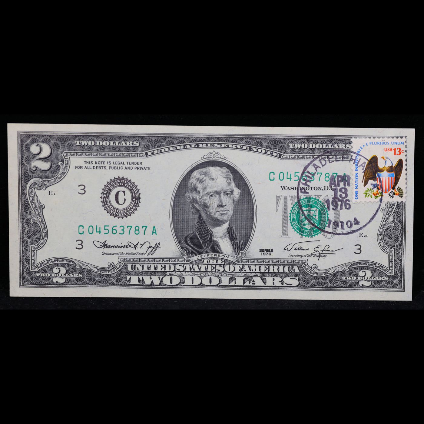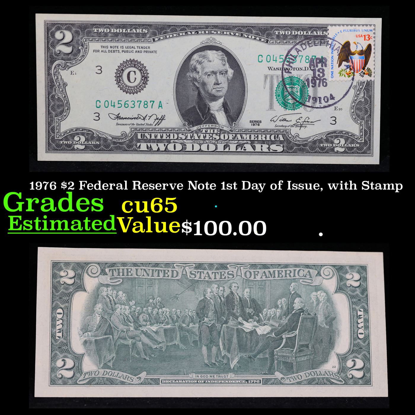 1976 $2 Federal Reserve Note 1st Day of Issue, with Stamp Grades Gem CU