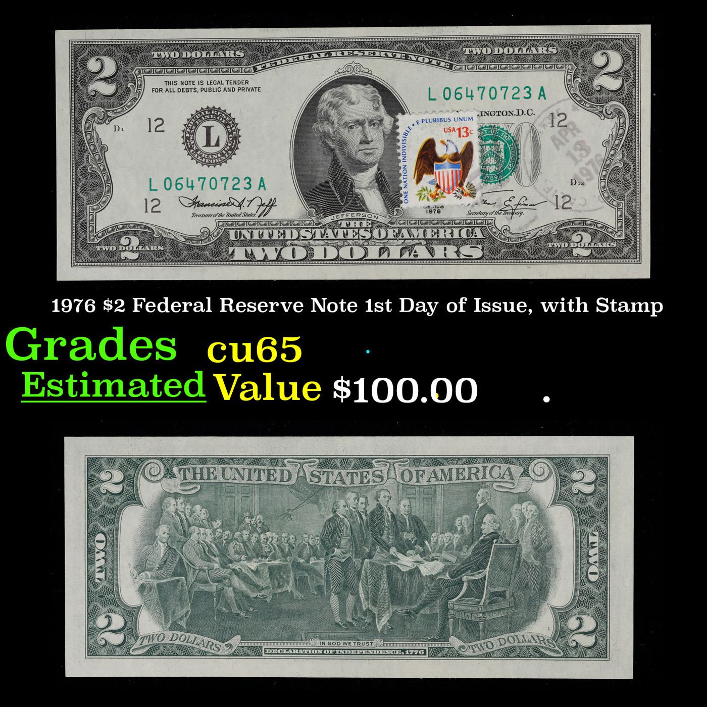 1976 $2 Federal Reserve Note 1st Day of Issue, with Stamp Grades Gem CU. On April 13, 1976, to celebrate the bicentennial of American independence, new $2 Federal Reserve Notes were issued with backs featuring the well-known painting Signing of the Declaration of Independence. These Notes all have a 13c Stamp or 2 stamps totaling 13c hand canceled on April 13, 1976 for the first day of issue of the new $2 notes. These official first-day-of-issue Bicentennial notes will be historic additions to your collection (designs and locations of the 13¢ stamps will vary).