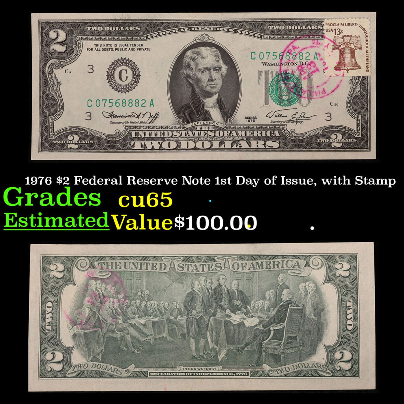 1976 $2 Federal Reserve Note 1st Day of Issue, with Stamp Grades Gem CU
