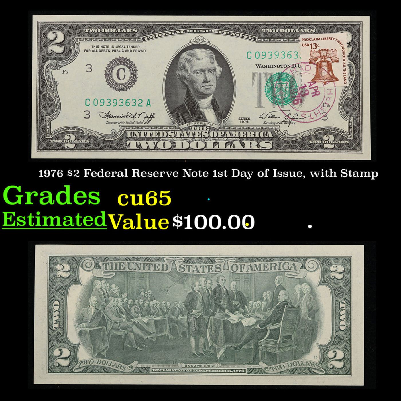1976 $2 Federal Reserve Note 1st Day of Issue, with Stamp Grades Gem CU
