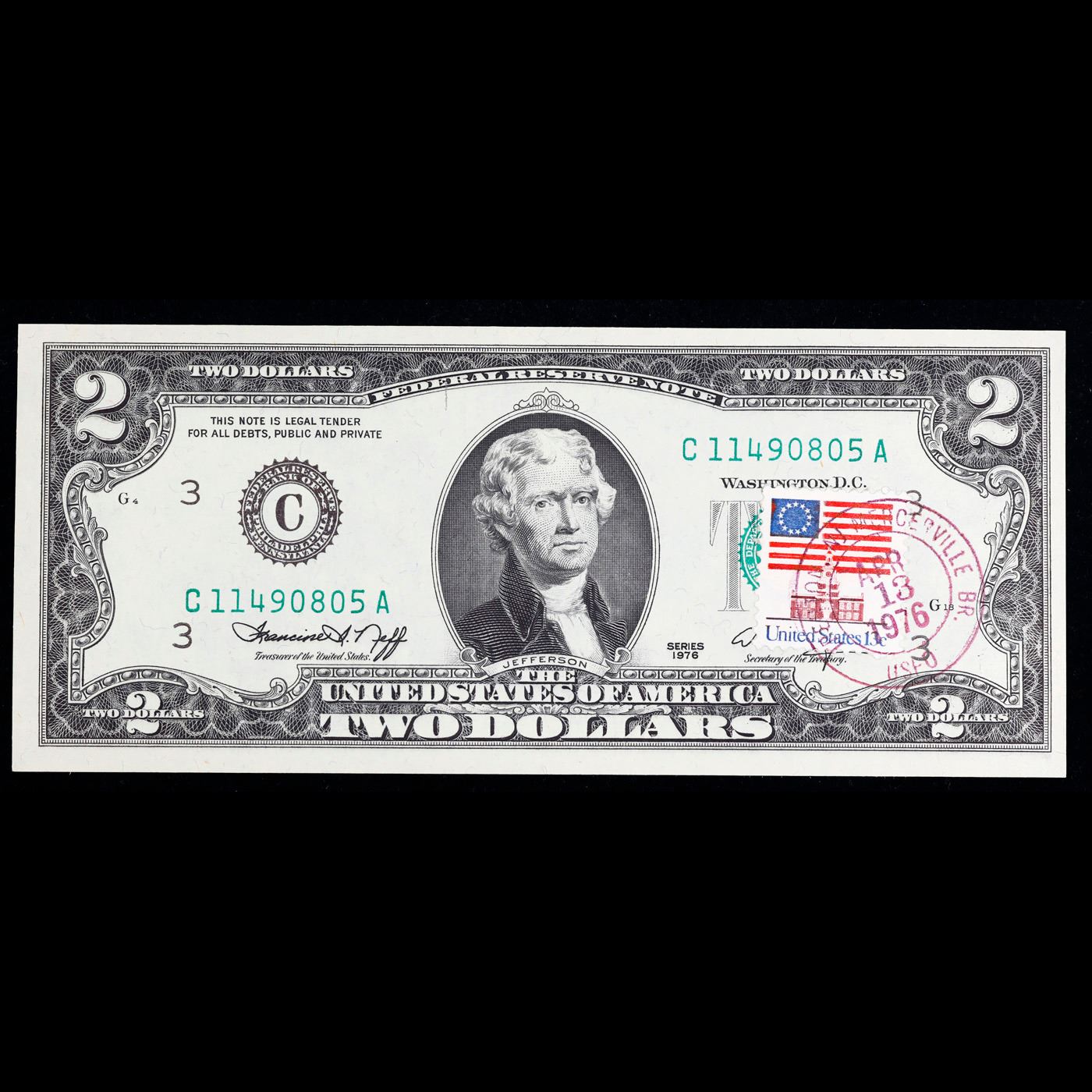 1976 $2 Federal Reserve Note 1st Day of Issue, with Stamp Grades Gem CU.