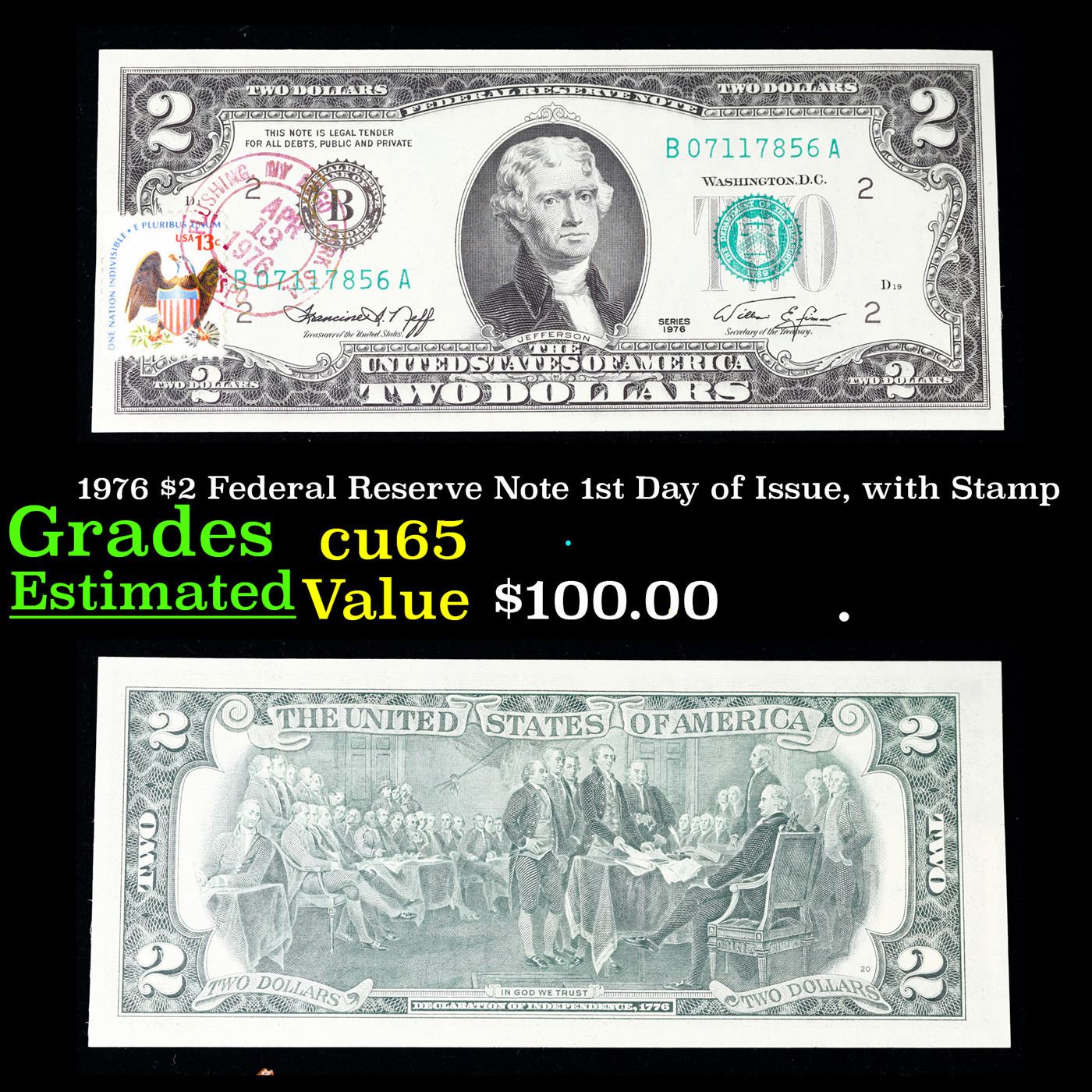 1976 $2 Federal Reserve Note 1st Day of Issue, with Stamp Grades Gem CU.