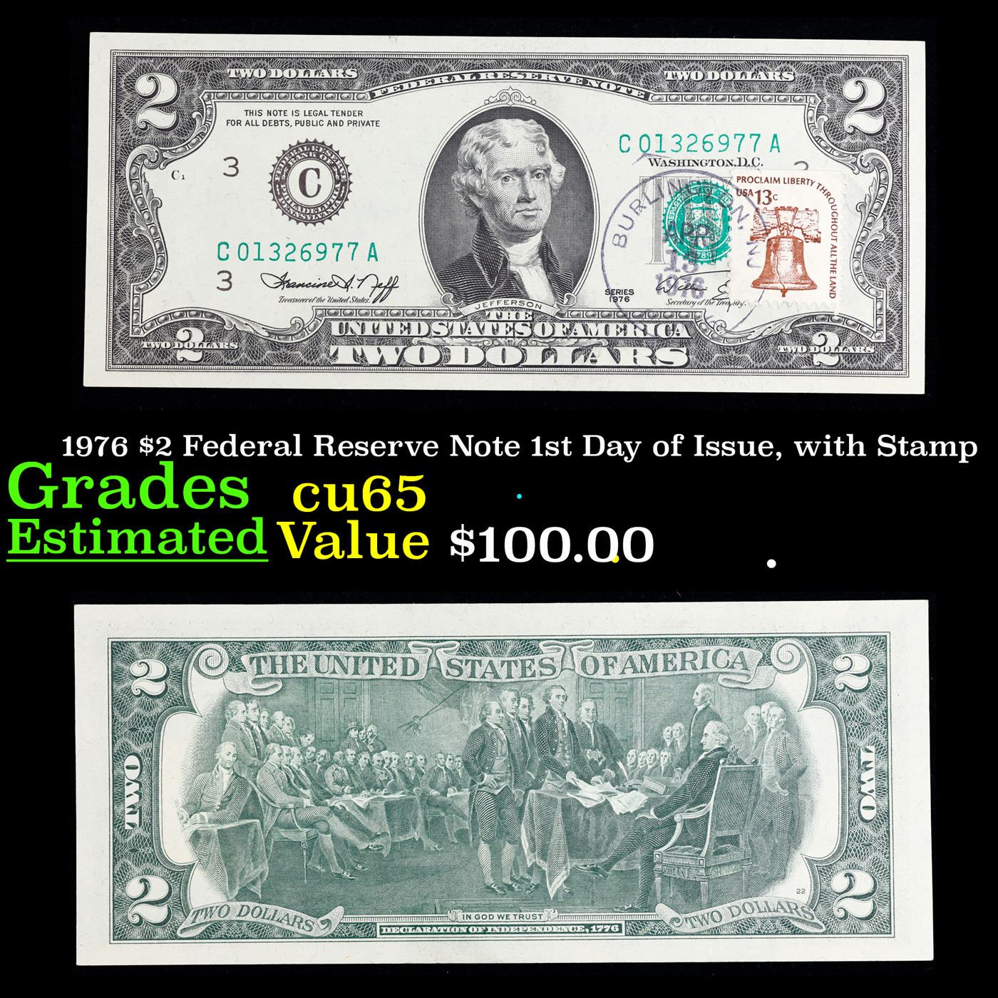 1976 $2 Federal Reserve Note 1st Day of Issue, with Stamp Grades Gem CU.