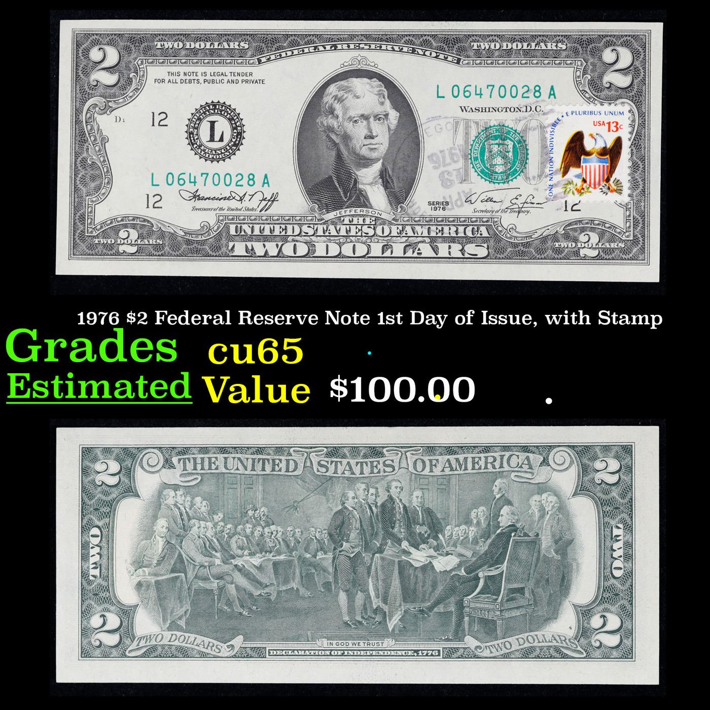 1976 $2 Federal Reserve Note 1st Day of Issue, with Stamp Grades Gem CU