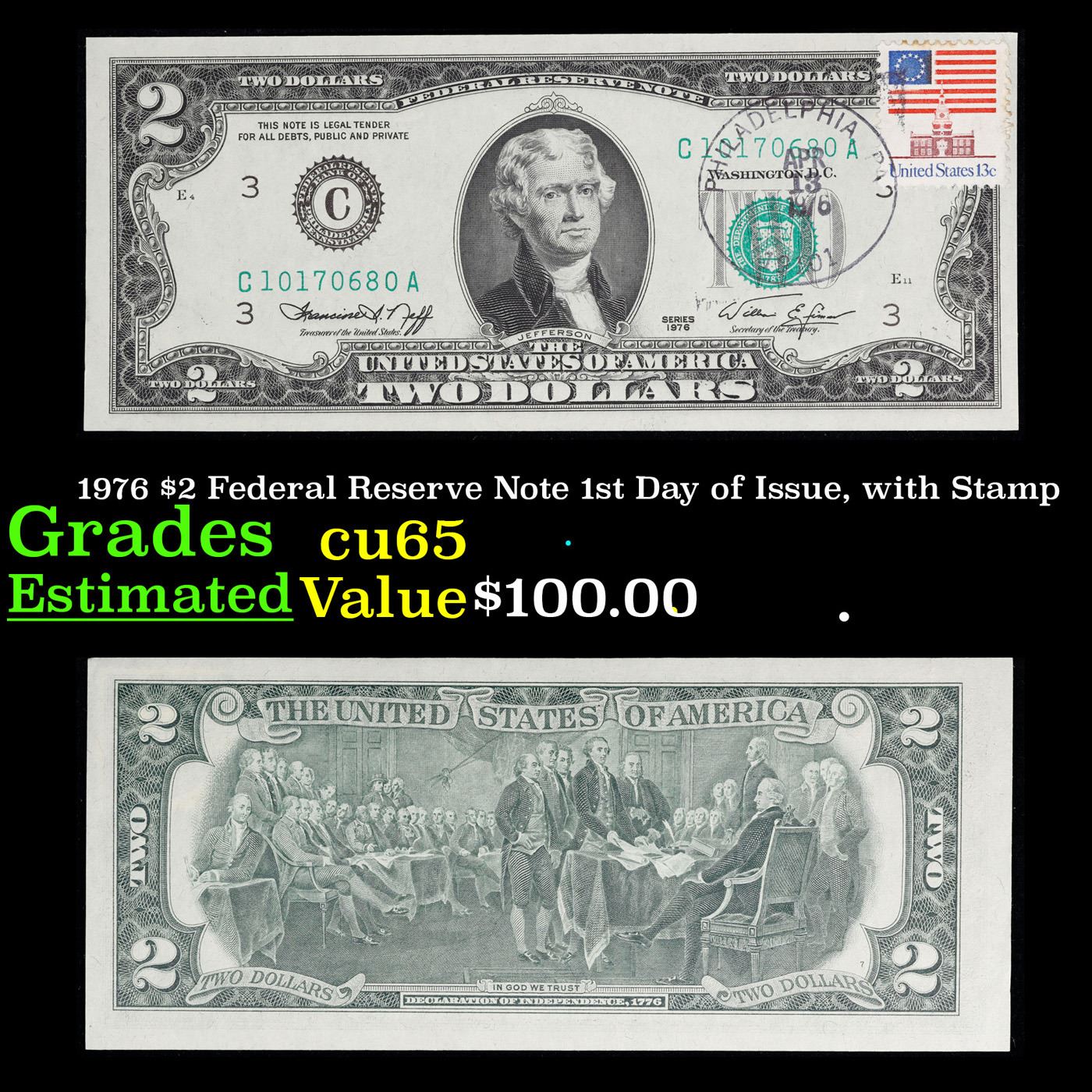 1976 $2 Federal Reserve Note 1st Day of Issue, with Stamp Grades Gem CU